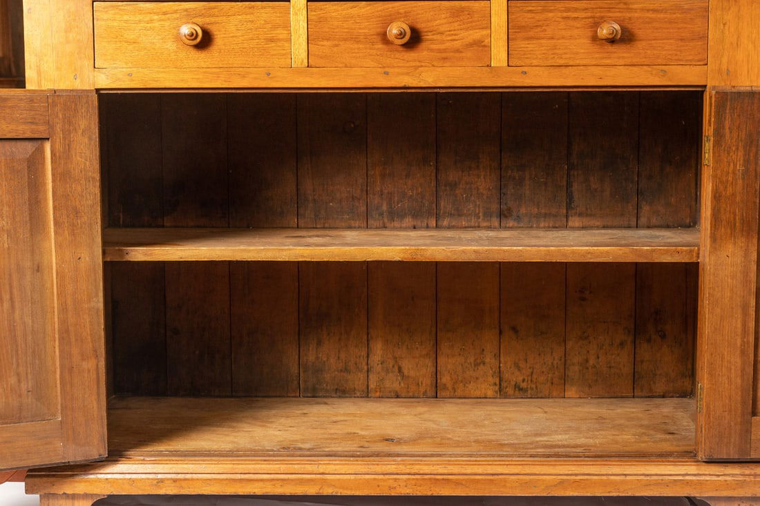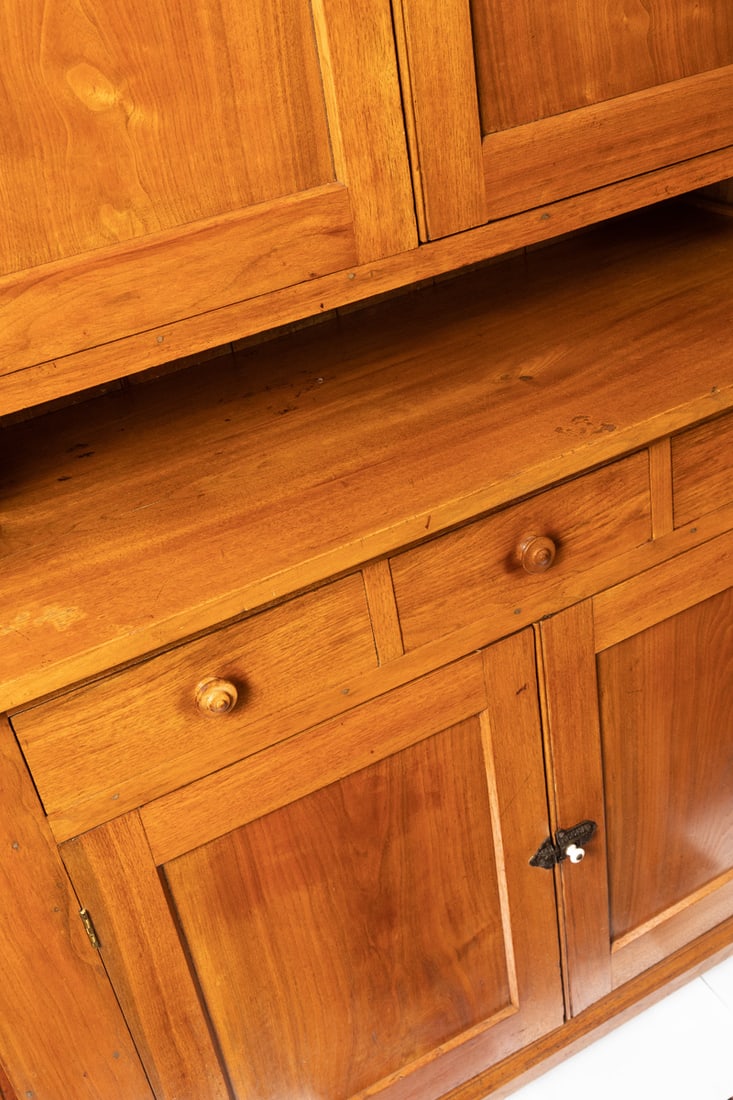 3rd quarter-19th century, walnut/butternut and poplar. A classic Zoar cupboard, with paneled upper and lower doors, three dovetailed drawers, and recessed block feet. 72" high, 49.75" wide, 18.5" deep. Provenance: the collection of the late Jo Louise Brown, Zoar, Ohio. Pickup or freight shipping is required for this lot. Please see our terms for details.