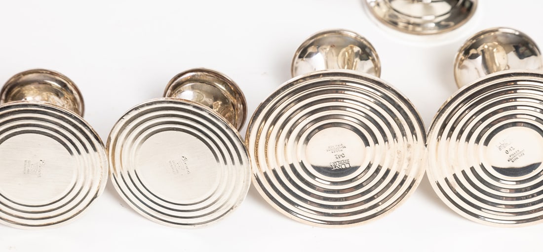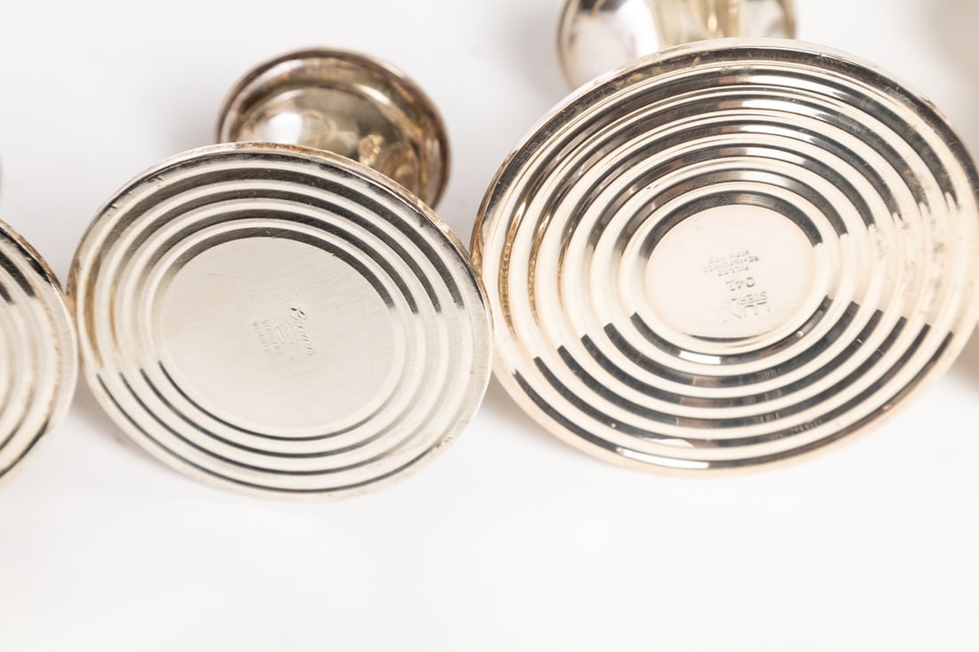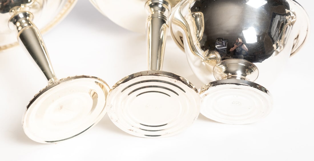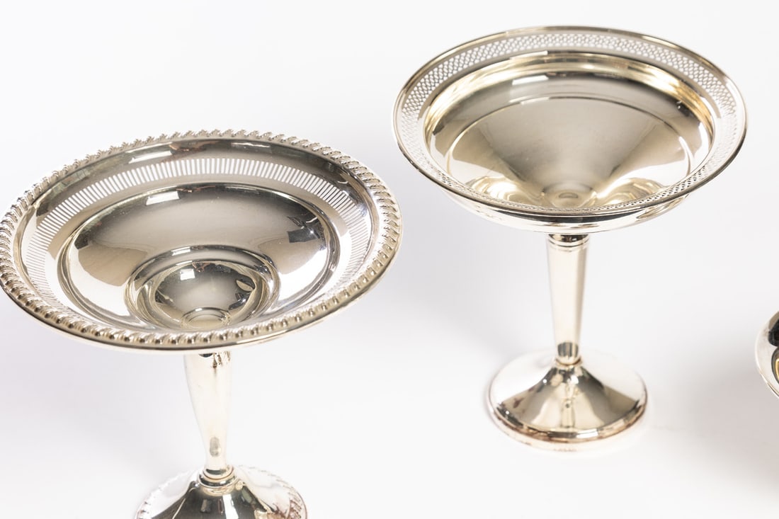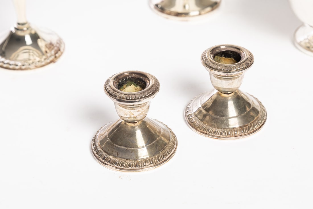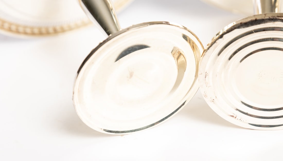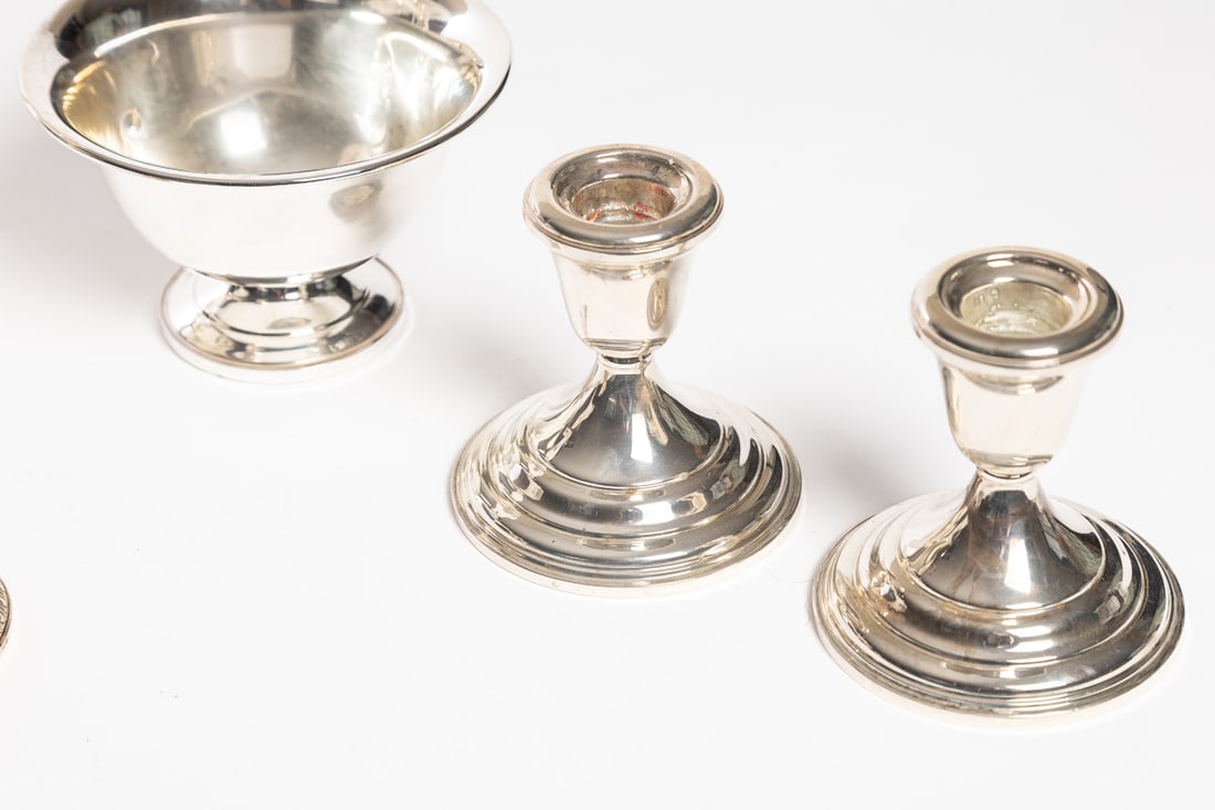 Includes two compotes, a bowl, and two pairs of candleholders, all marked sterling and with weighted bases. Compotes are 6.25" high. Provenance: the collection of the late Jo Louise Brown, Zoar, Ohio. In-house shipping is available for this lot. Please see our terms for details.