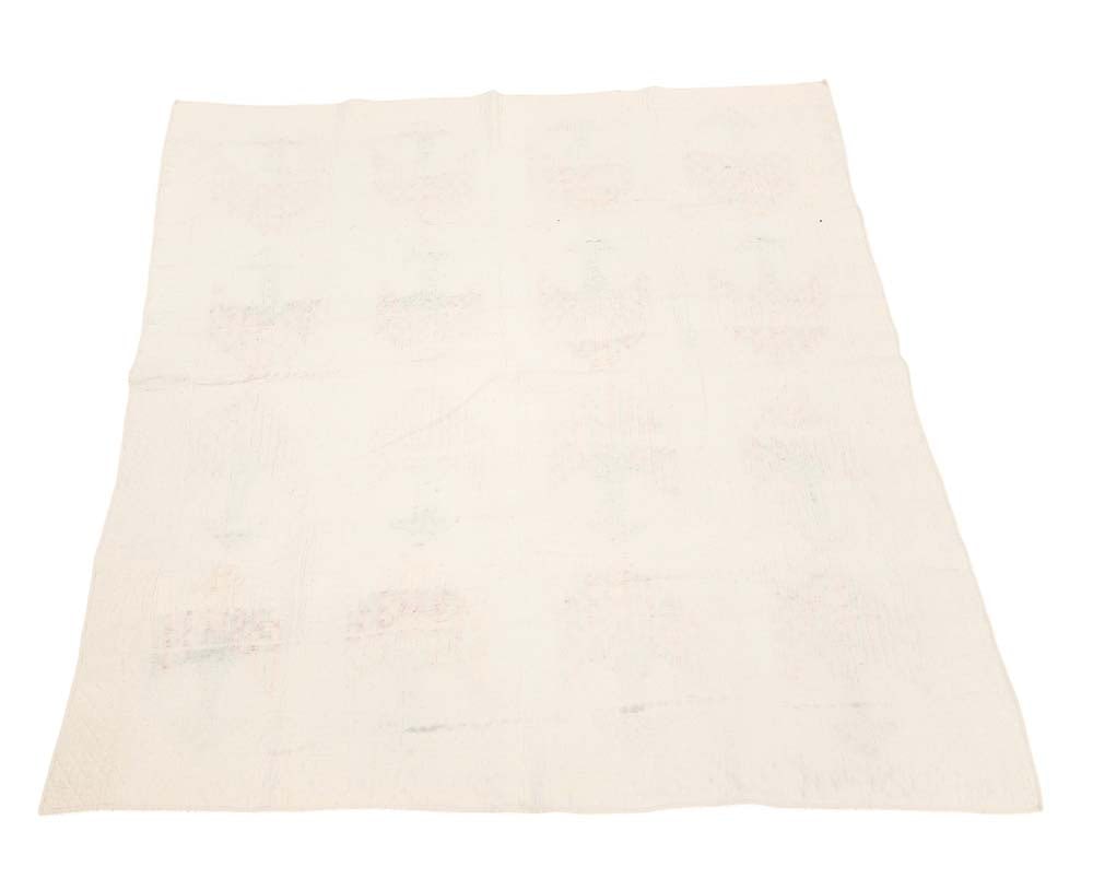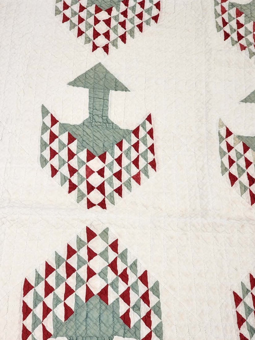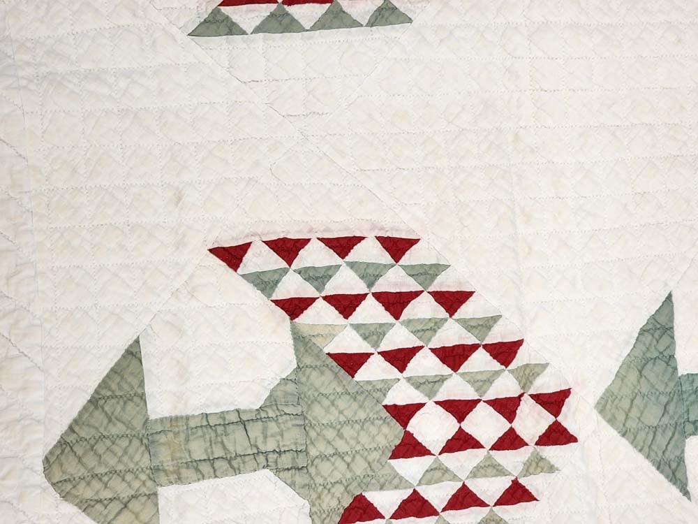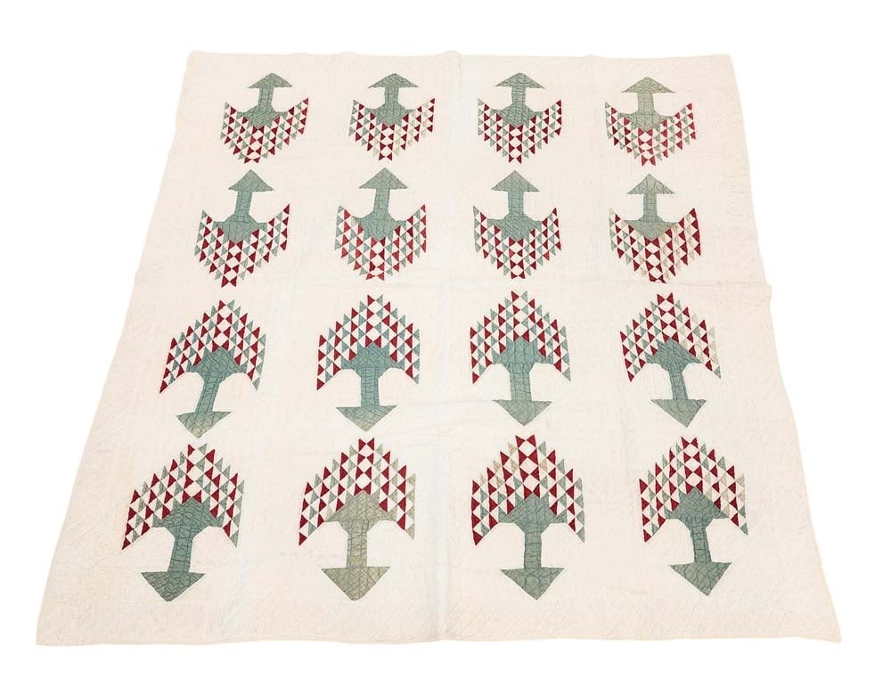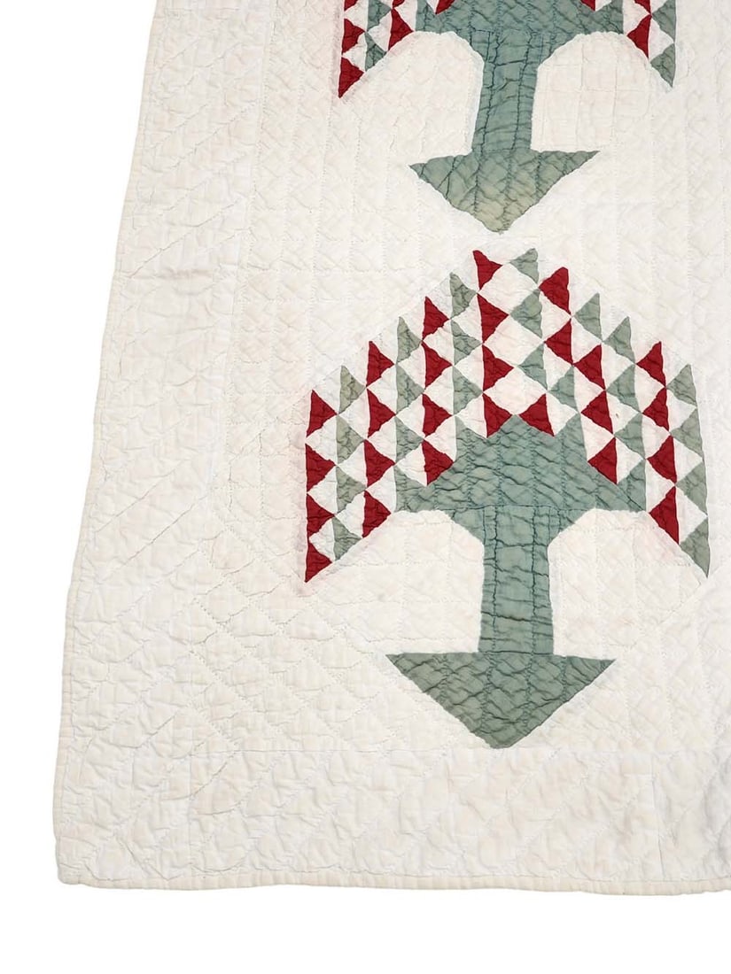 American, late 19th century. Pieced in red and green, with feathered wreath quilting. 75" by 72". Provenance: the collection of the late Jo Louise Brown, Zoar, Ohio. In-house shipping is available for this lot. Please see our terms for details.