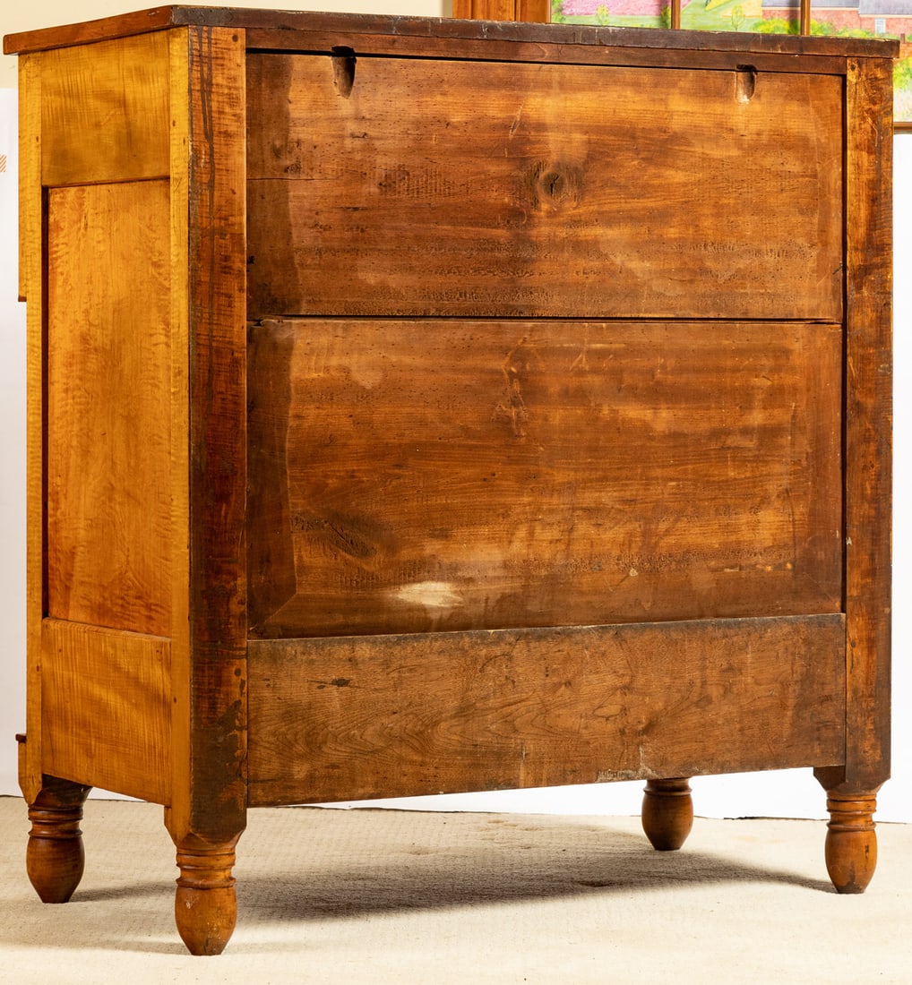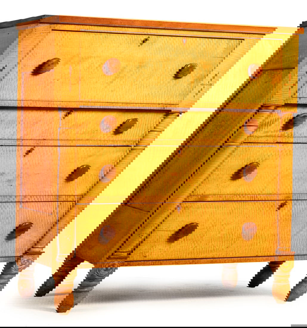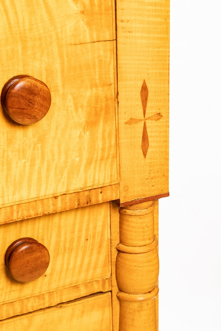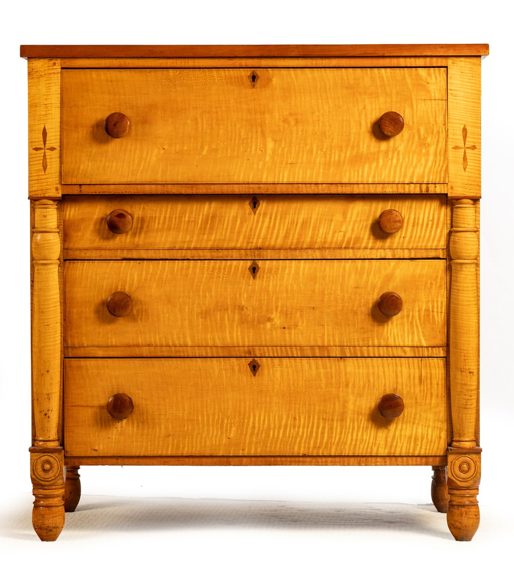 Probably Ohio, 2nd quarter-19th century, curly maple, with cherry, walnut, and poplar. Large top drawer over three graduated drawers, with inlaid decoration. 45" high, 42" wide, 21" deep. Provenance: the collection of the late Jo Louise Brown, Zoar, Ohio. Pickup or freight shipping is required for this lot. Please see our terms for details.