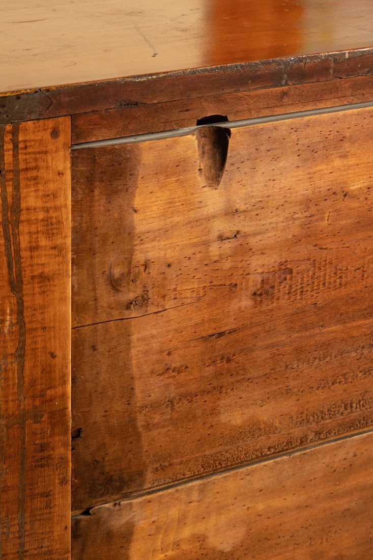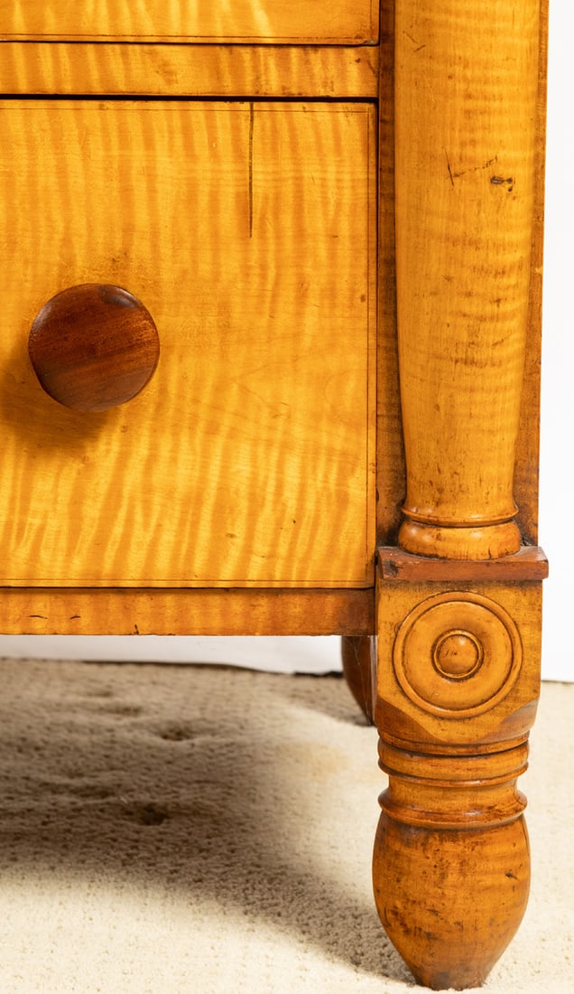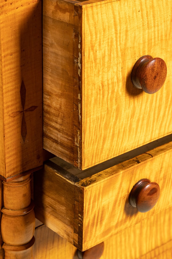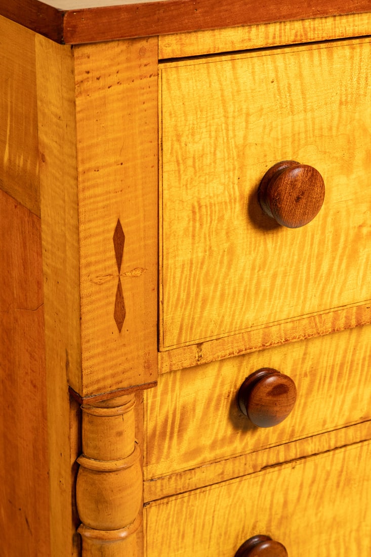 Probably Ohio, 2nd quarter-19th century, curly maple, with cherry, walnut, and poplar. Large top drawer over three graduated drawers, with inlaid decoration. 45" high, 42" wide, 21" deep. Provenance: the collection of the late Jo Louise Brown, Zoar, Ohio. Pickup or freight shipping is required for this lot. Please see our terms for details.
