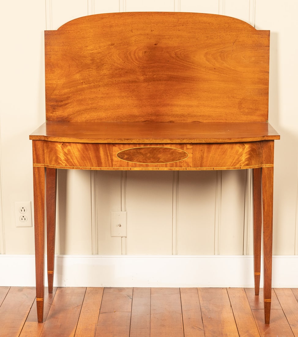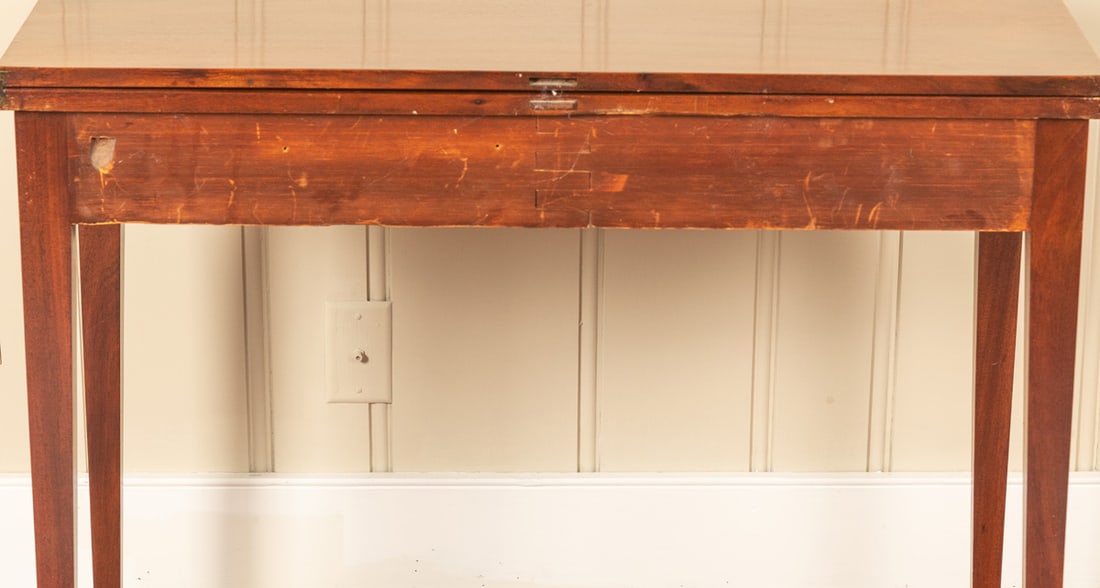 Possibly Salem, Massachusetts, 1790-1810, mahogany. With inlaid and veneered decoration, and tapered legs with inlaid cuffs. 29.5" high, 36" wide, 17.75" deep (closed). According to Mrs. Brown’s notes, this table came out of 53 Summer St., Salem, MA–the same house as the blue sea chest in this auction. Provenance: the collection of the late Jo Louise Brown, Zoar, Ohio. Pickup or freight shipping is required for this lot. Please see our terms for details.