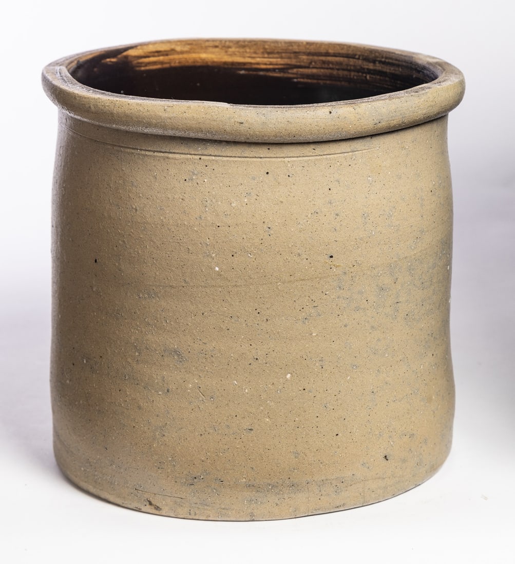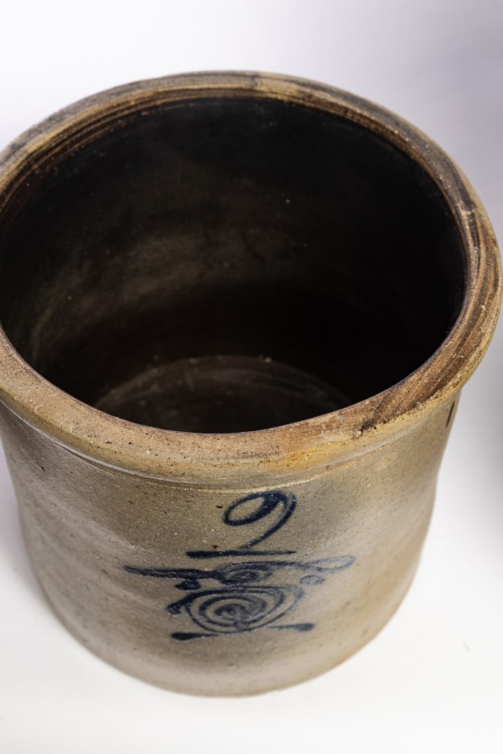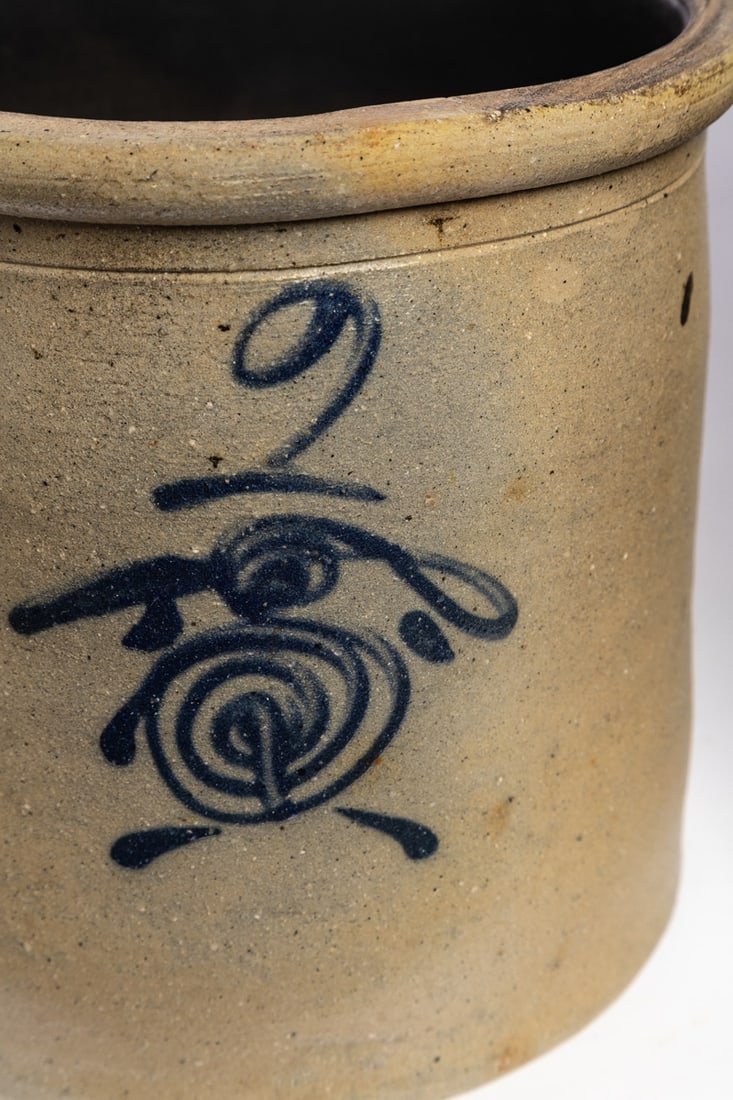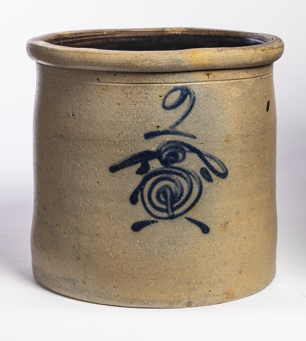 Midwestern, mid-late 19th century. Two-gallon crock with freehand cobalt decoration. 9" high. Provenance: the collection of the late Jo Louise Brown, Zoar, Ohio. In-house shipping is available for this lot. Please see our terms for details.
