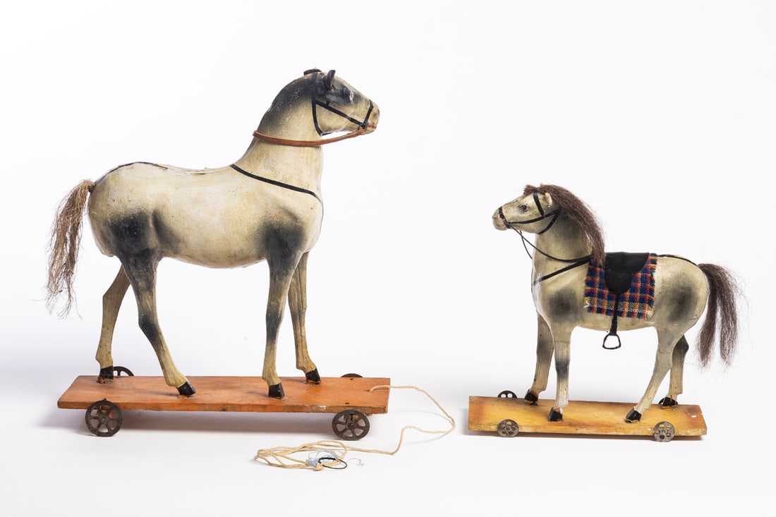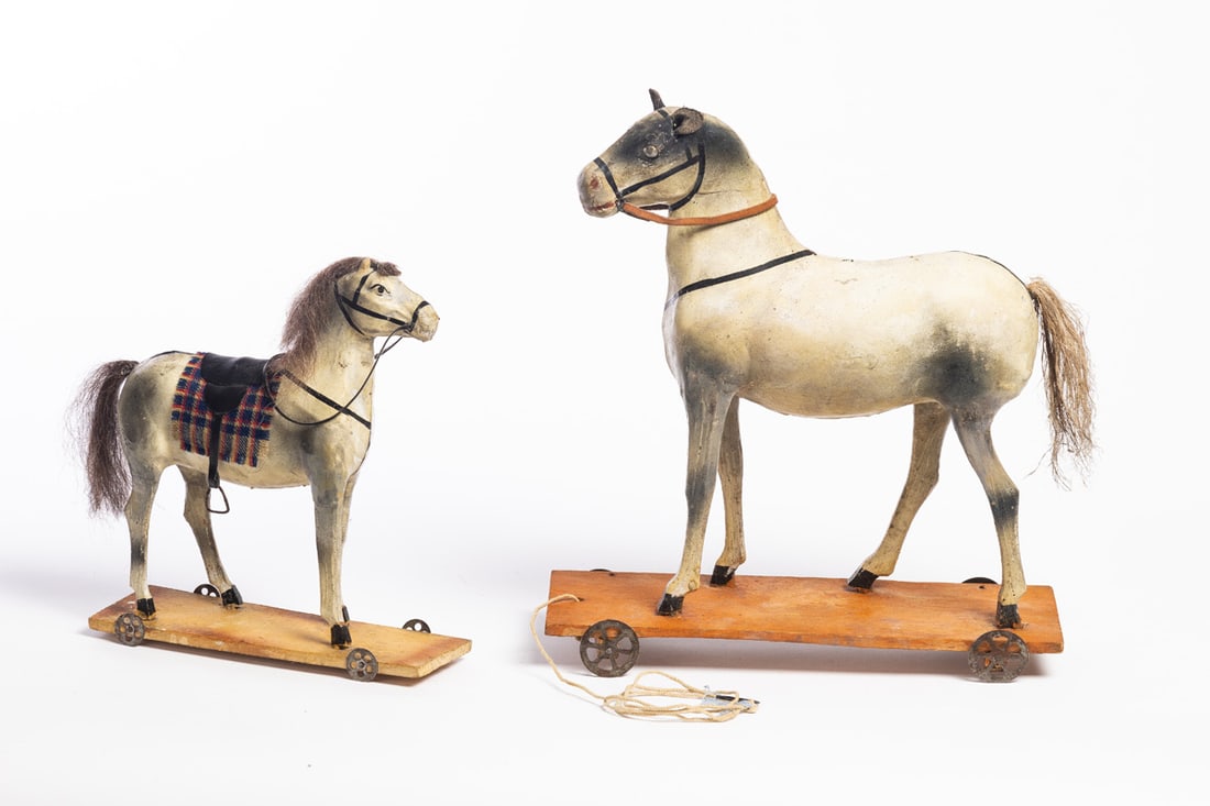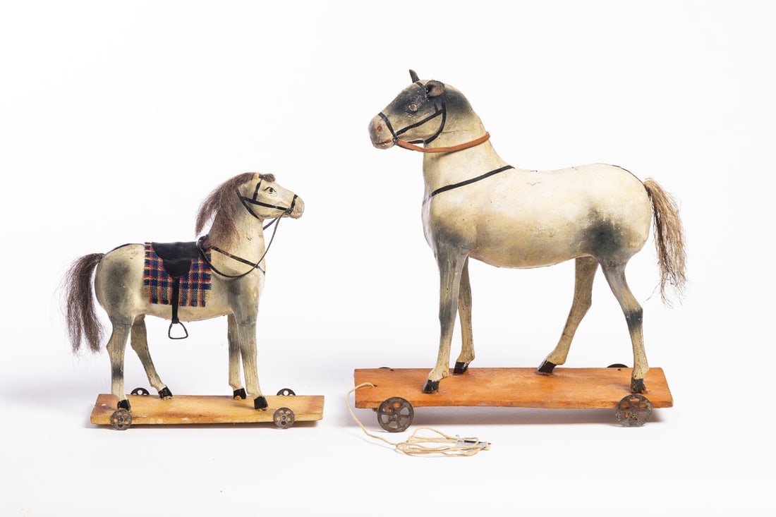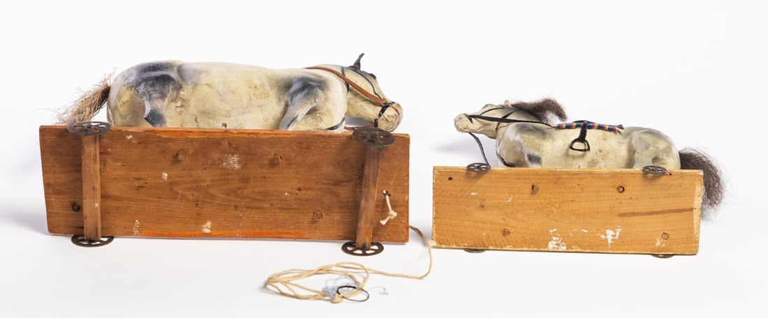 Late 19th century, papier mache. Both with original black and white paint, the larger with leather ears. 9.5" and 12" long. Provenance: the collection of the late Jo Louise Brown, Zoar, Ohio. In-house shipping is available for this lot. Please see our terms for details.