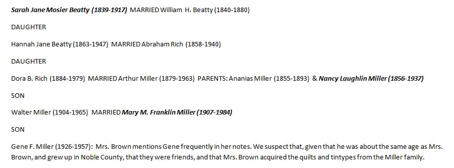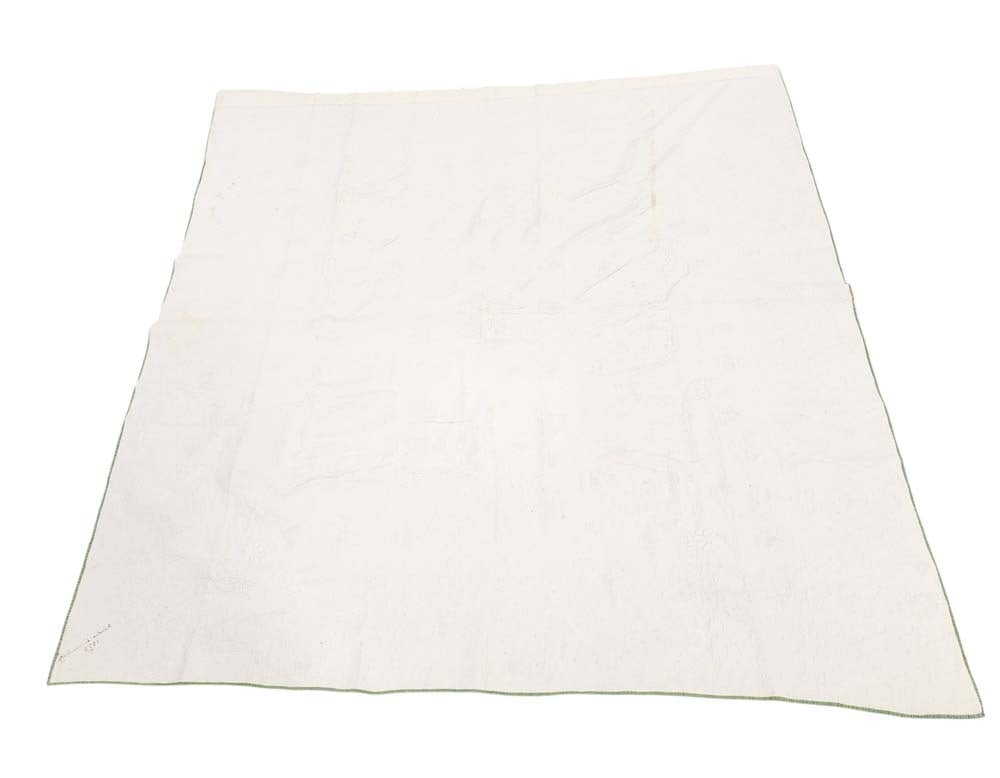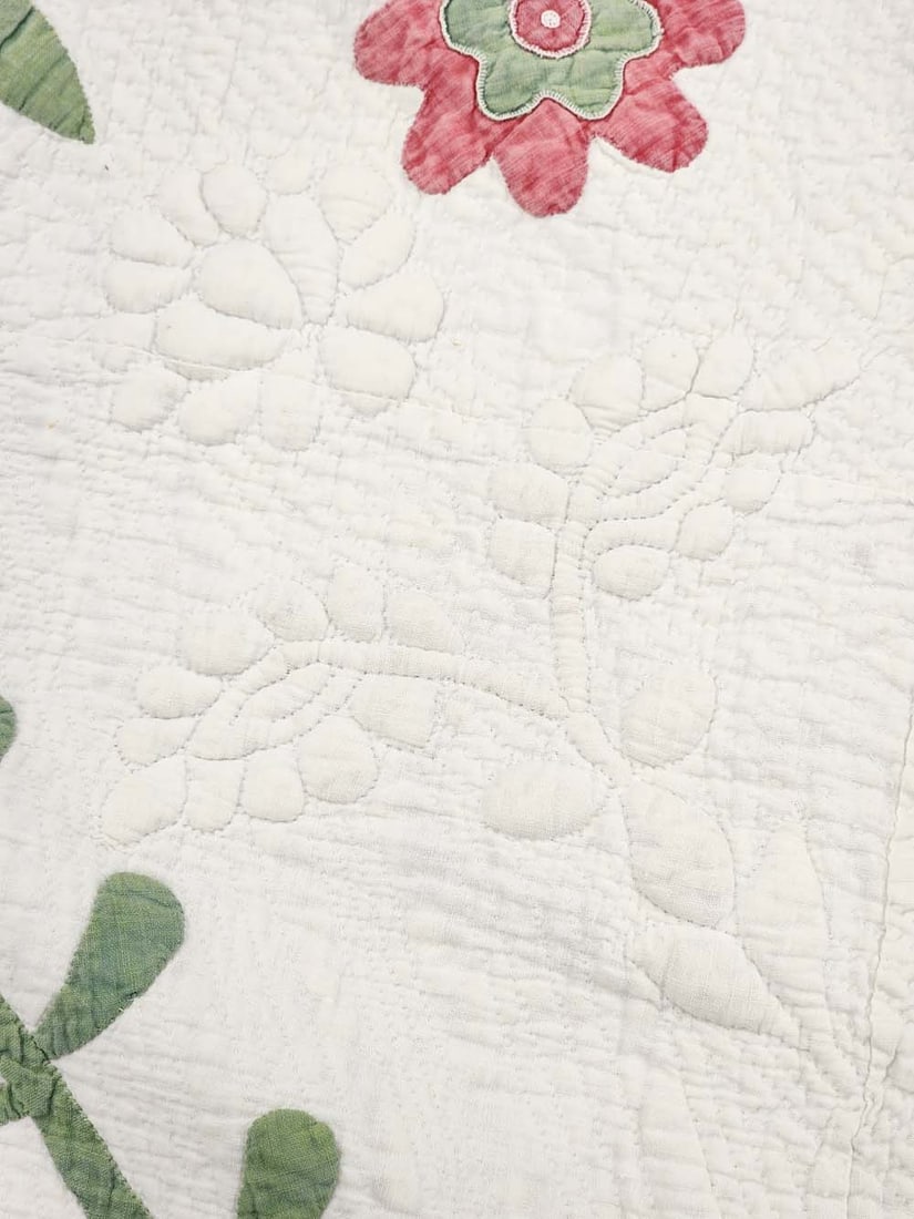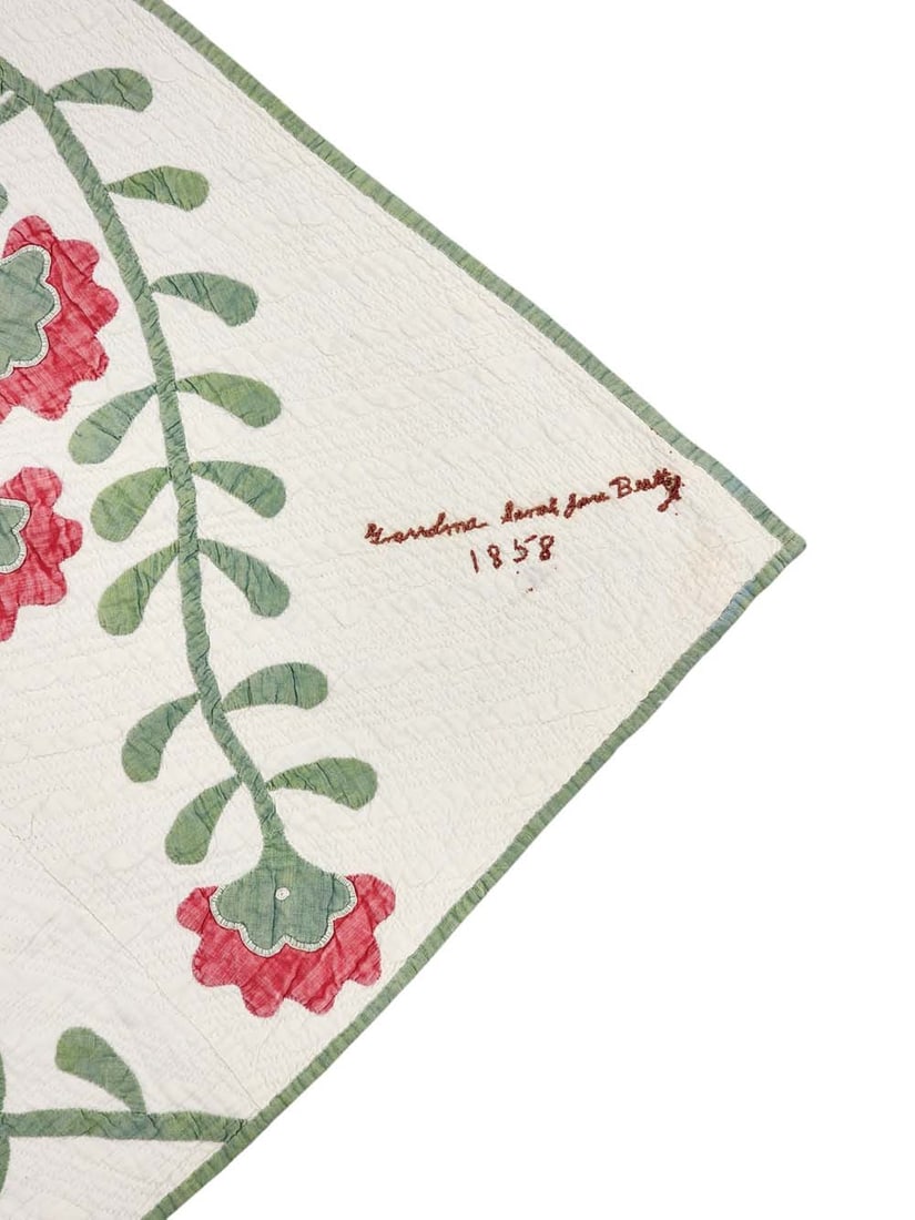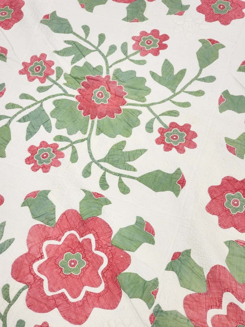 Embroidered "Grandma Sarah Jane Beatty" and dated 1858. Central field of roses and a floral vining border, in red and green, with elaborate quilting and stuffed work. 84" by 84". Sarah Jane Beatty (1839-1917) was born in Guernsey County to Abraham and Hannah Mosier. She married William Beatty in 1861 and the couple settled in Noble County shortly thereafter. William died in 1880 after being kicked in the head by a horse. The emboidered name and date may have been added by Sarah Jane’s grandaughter, Dora Rich Miller, whose mother-in-law Nancy Laughlin Miller, made many of the quilts in this auction. Illustrated in Ricky Clark, Quilted Gardens, p. 50. Provenance: the collection of the late Jo Louise Brown, Zoar, Ohio. In-house shipping is available for this lot. Please see our terms for details.