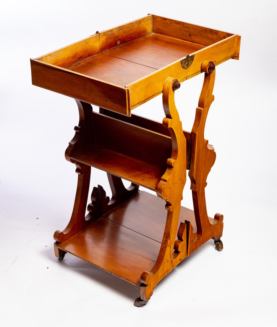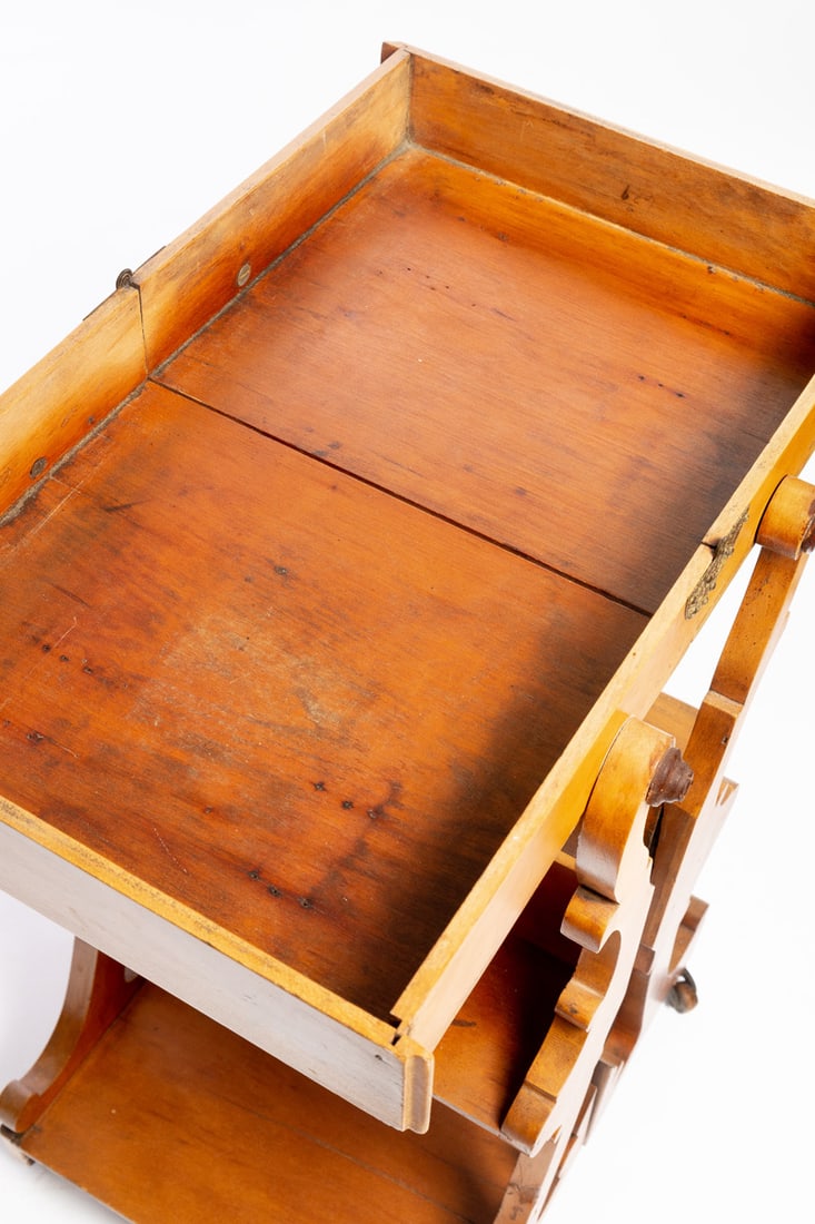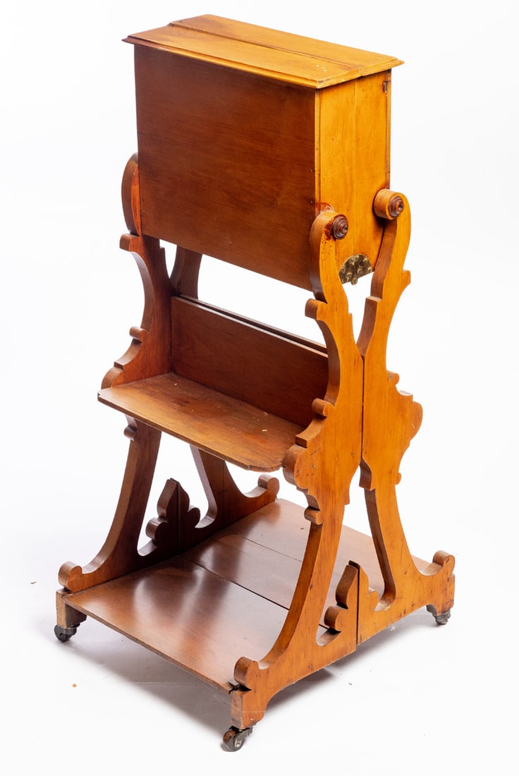 American, late 19th century, cherry. Scroll-cut sides. It opens to form a tray at the top. 34" high (closed). Provenance: the collection of the late Jo Louise Brown, Zoar, Ohio. Pickup or freight shipping is required for this lot. Please see our terms for details.