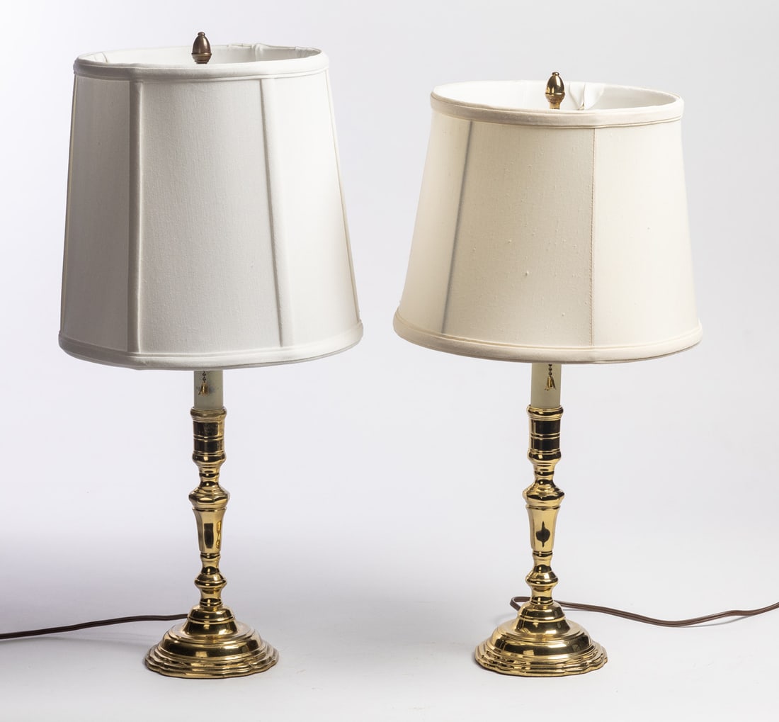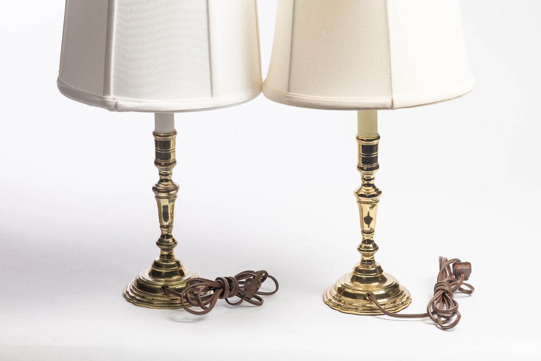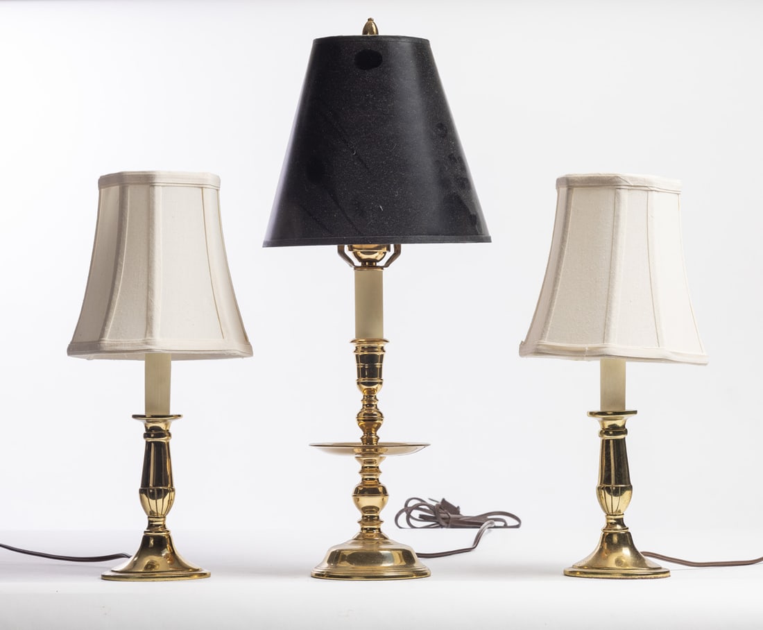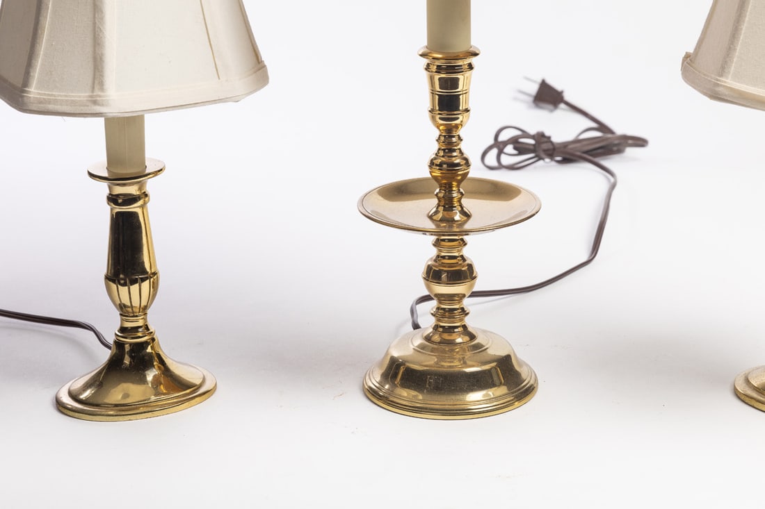 Brass, includes a pair with mismatched shades, a single with a drip pan, and a small pair. Tallest is 21" high. Provenance: the collection of the late Jo Louise Brown, Zoar, Ohio. In-house shipping is available for this lot. Please see our terms for details.
