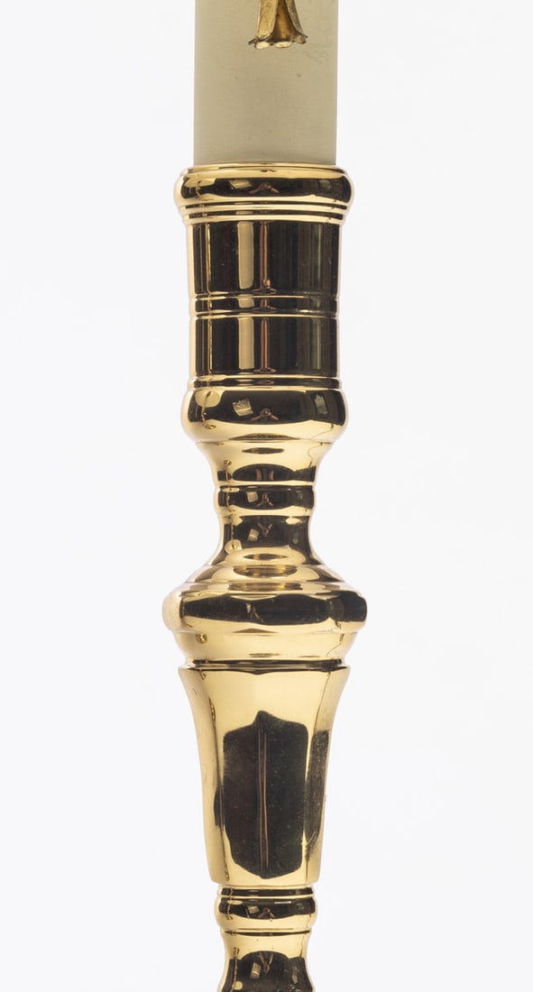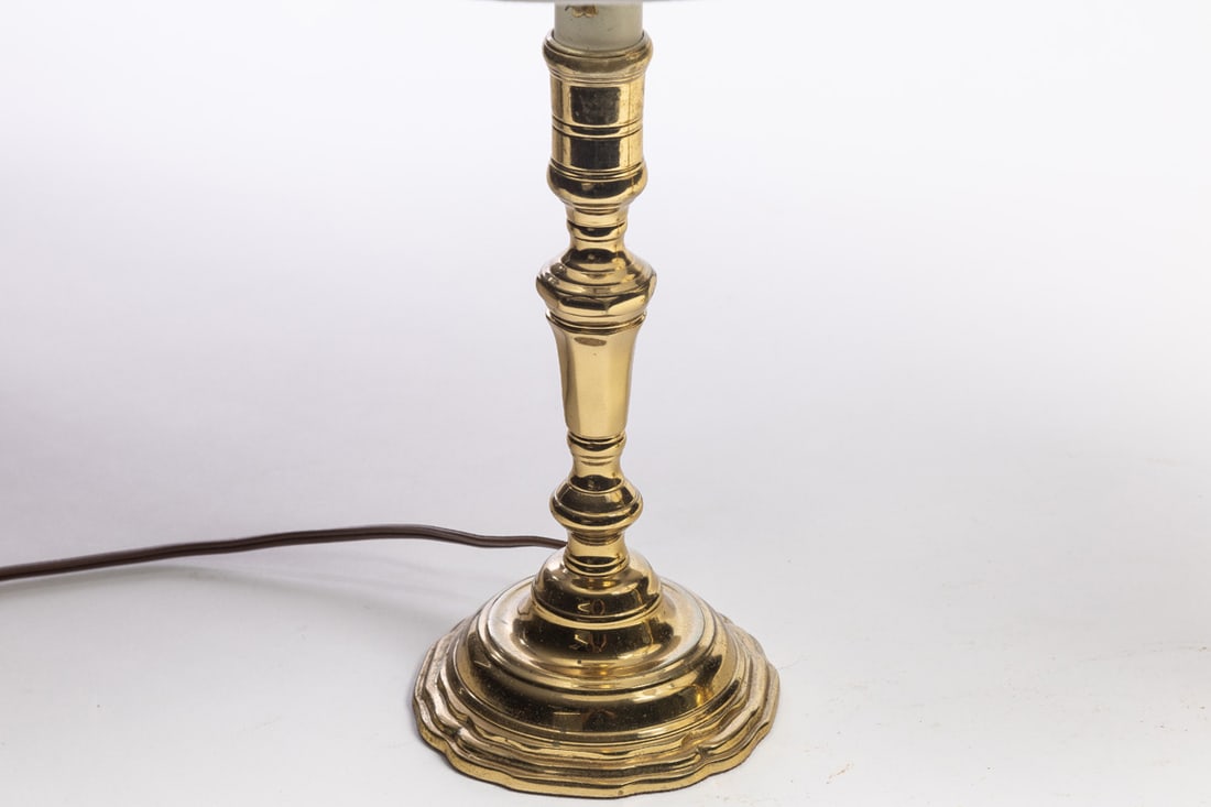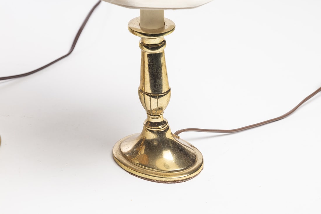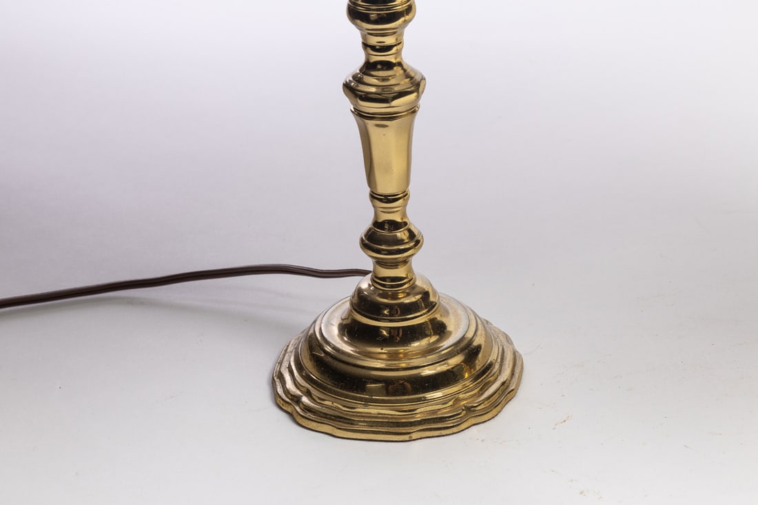 Brass, includes a pair with mismatched shades, a single with a drip pan, and a small pair. Tallest is 21" high. Provenance: the collection of the late Jo Louise Brown, Zoar, Ohio. In-house shipping is available for this lot. Please see our terms for details.