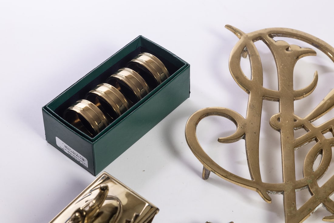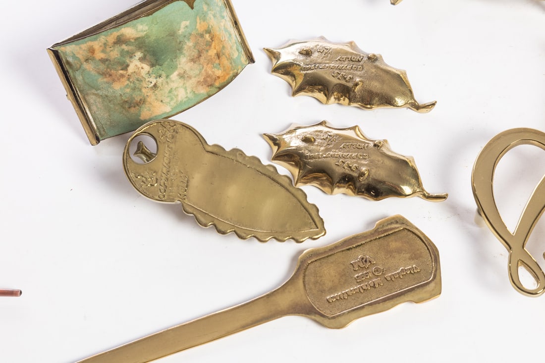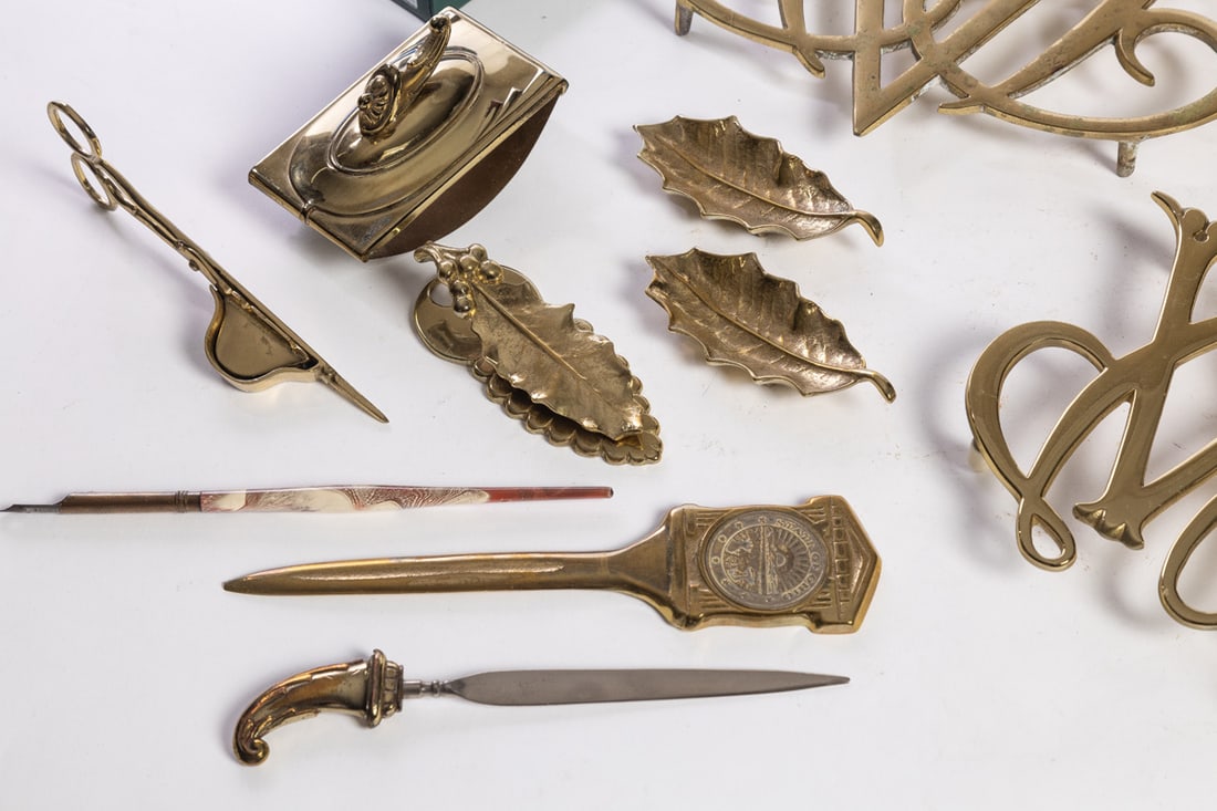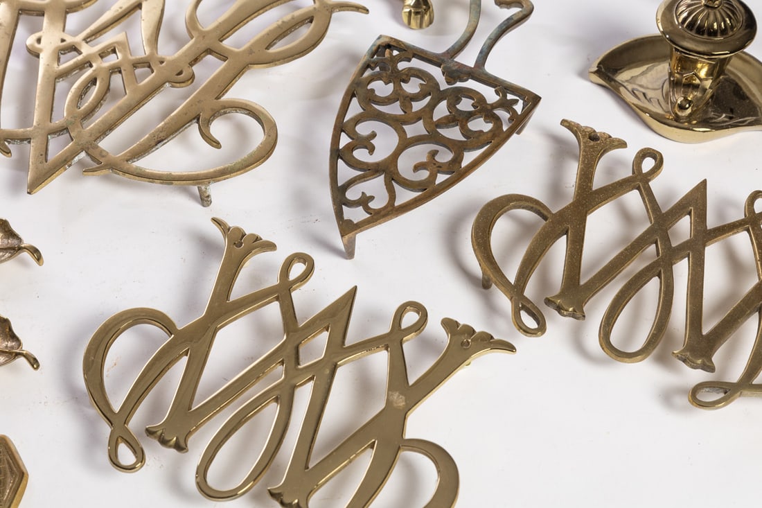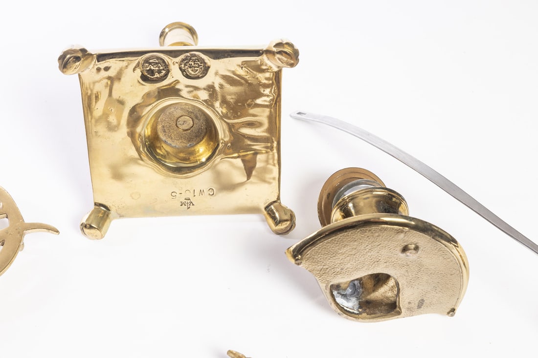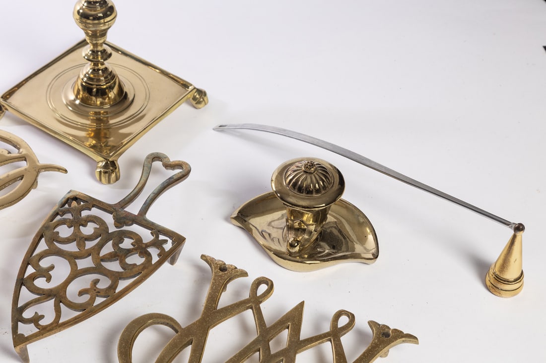 Williamsburg, miscellaneous group including trivets, desk accessories, a candlestick, and more. The stick is 7" high. Provenance: the collection of the late Jo Louise Brown, Zoar, Ohio. In-house shipping is available for this lot. Please see our terms for details.