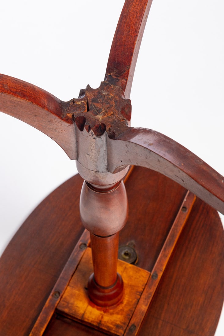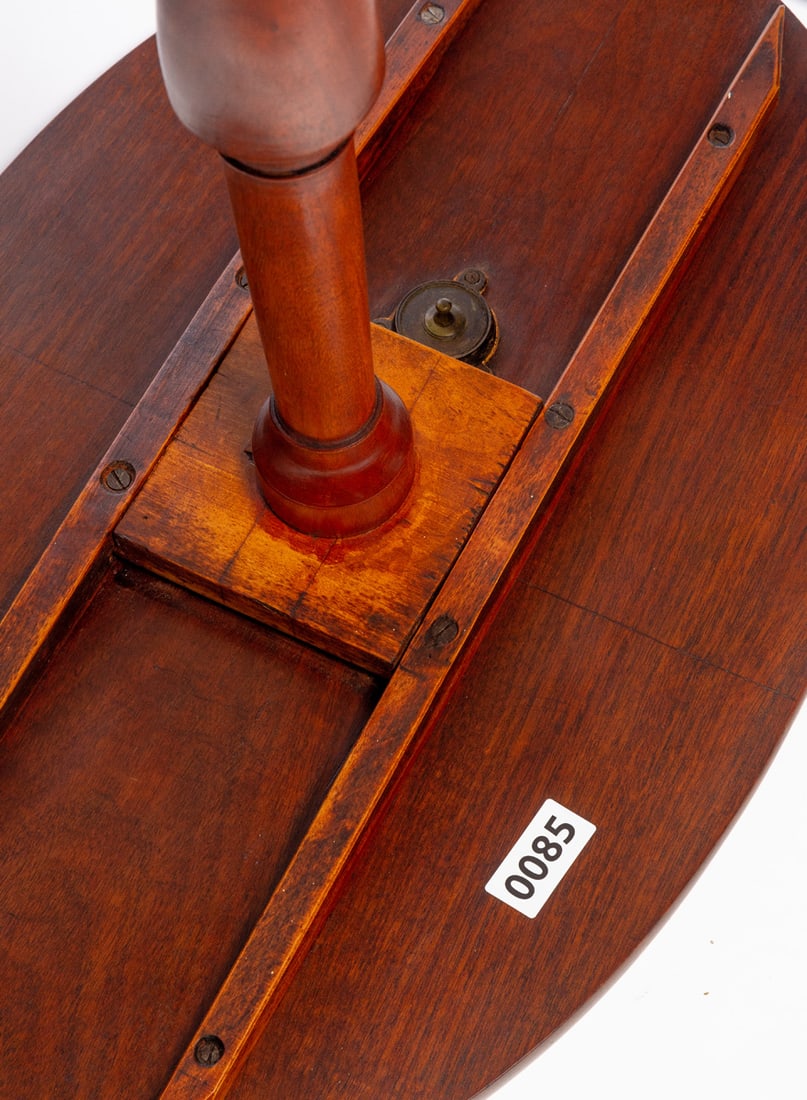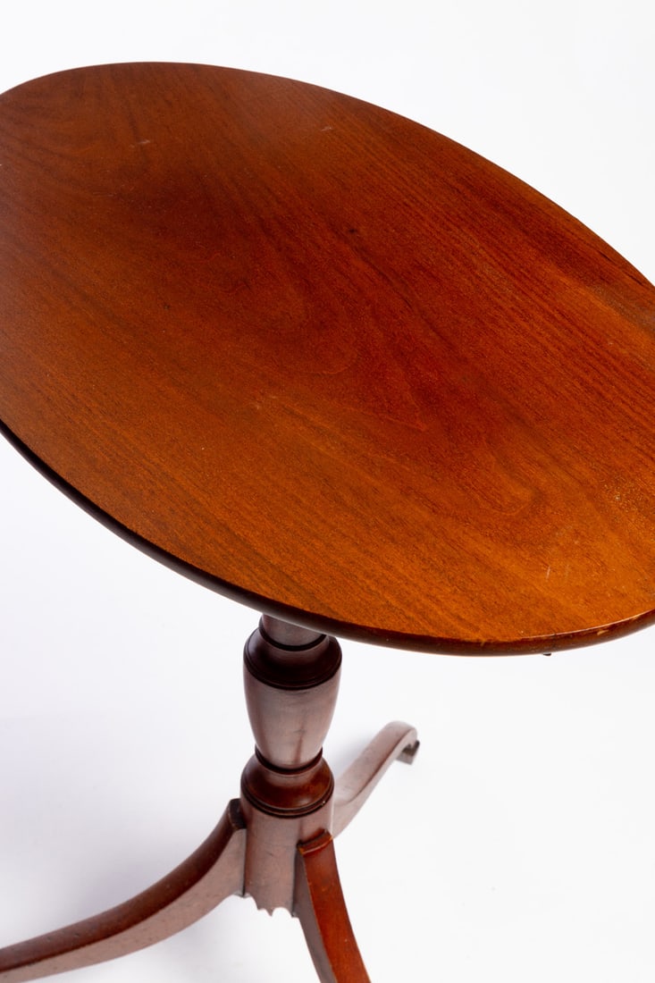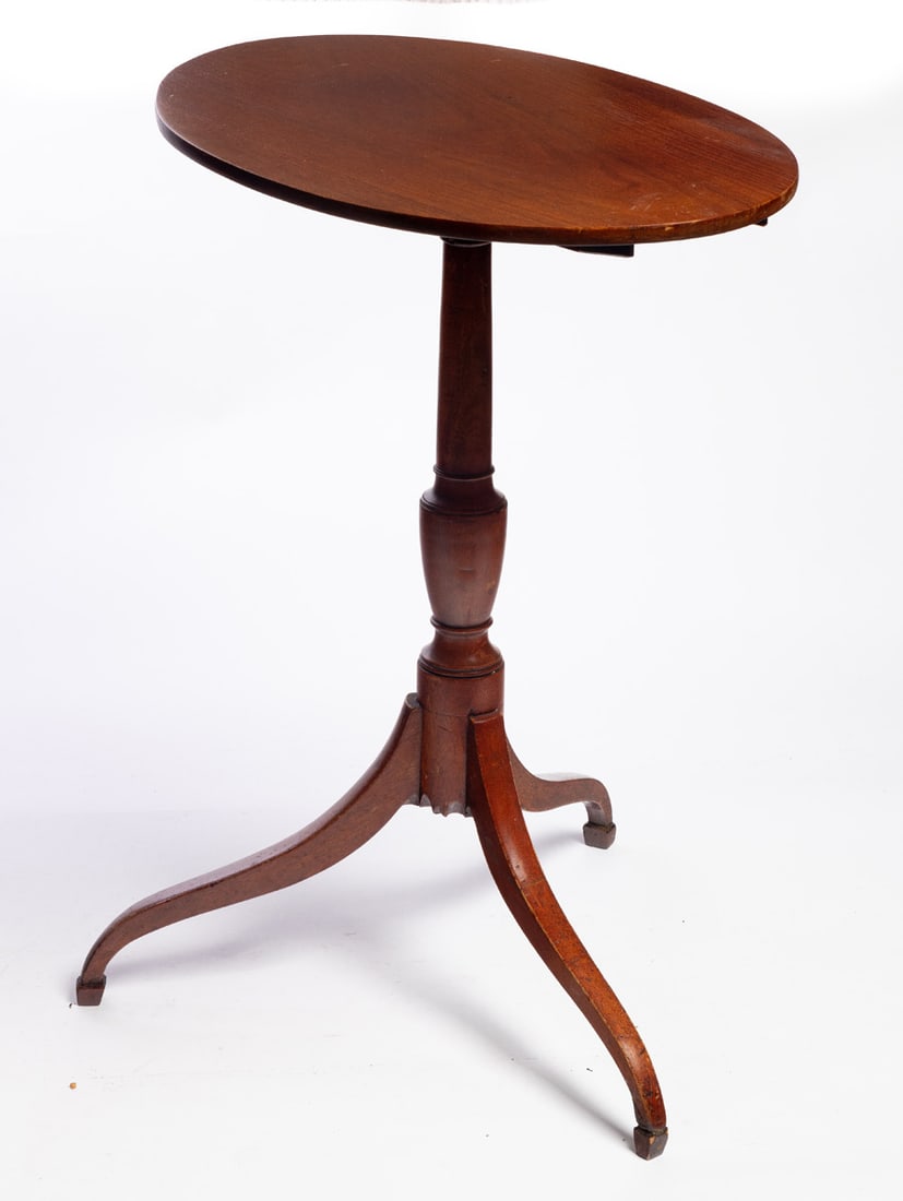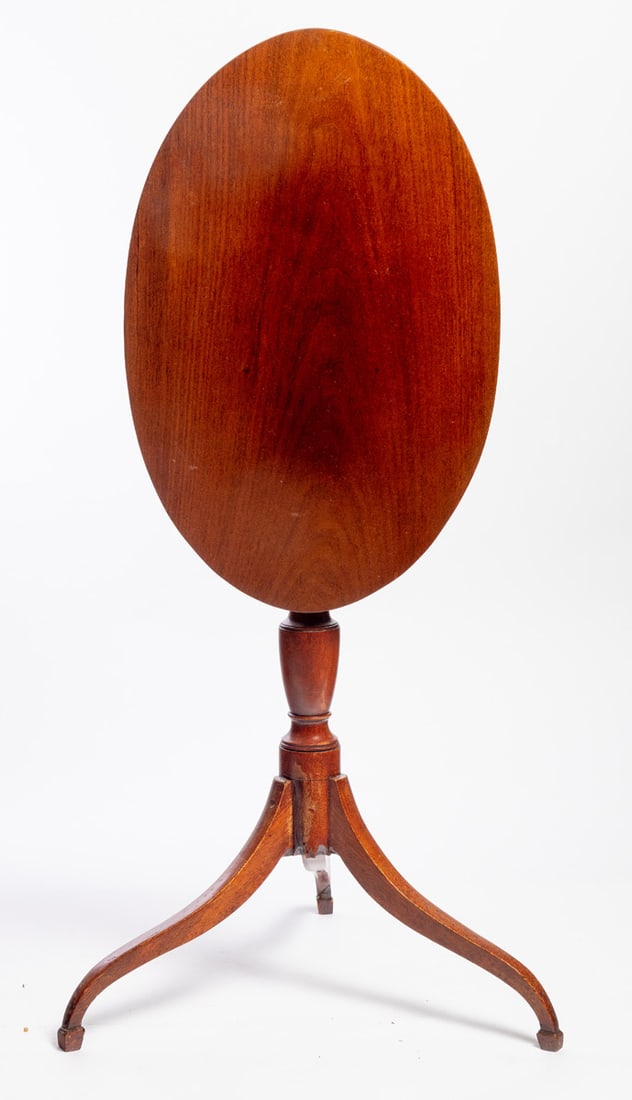 American, early 19th century, walnut. Oval top, turned standard, and tripod base. 26.5" high. Provenance: the collection of the late Jo Louise Brown, Zoar, Ohio. Pickup or freight shipping is required for this lot. Please see our terms for details.