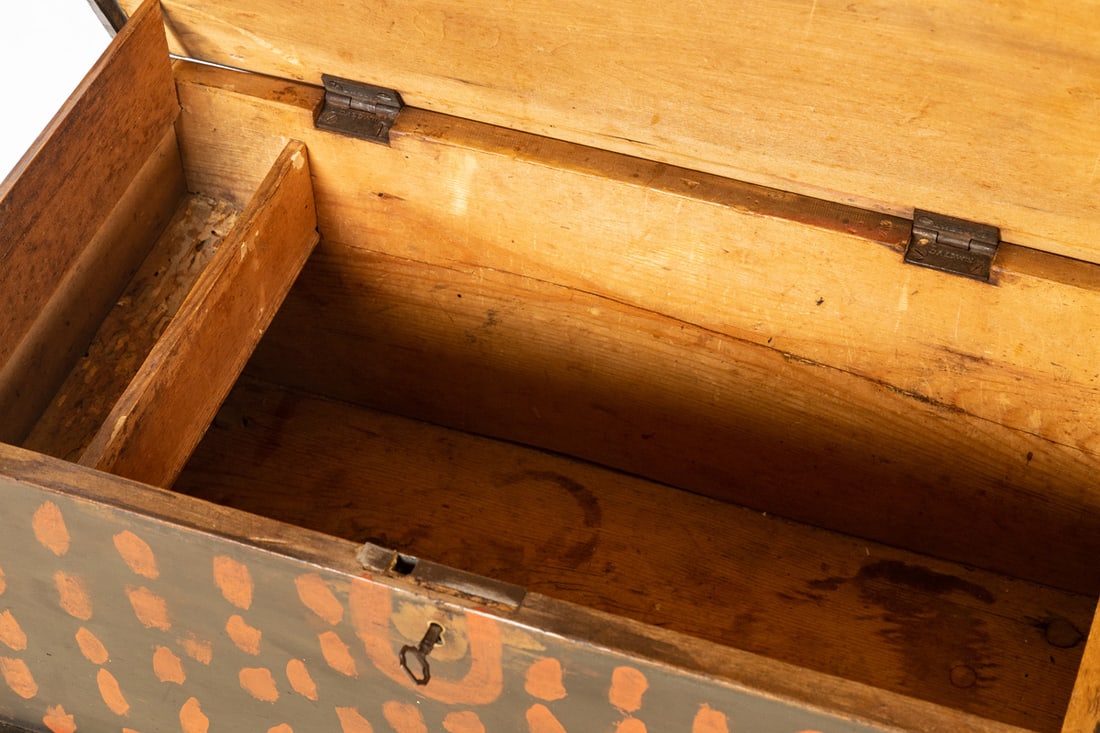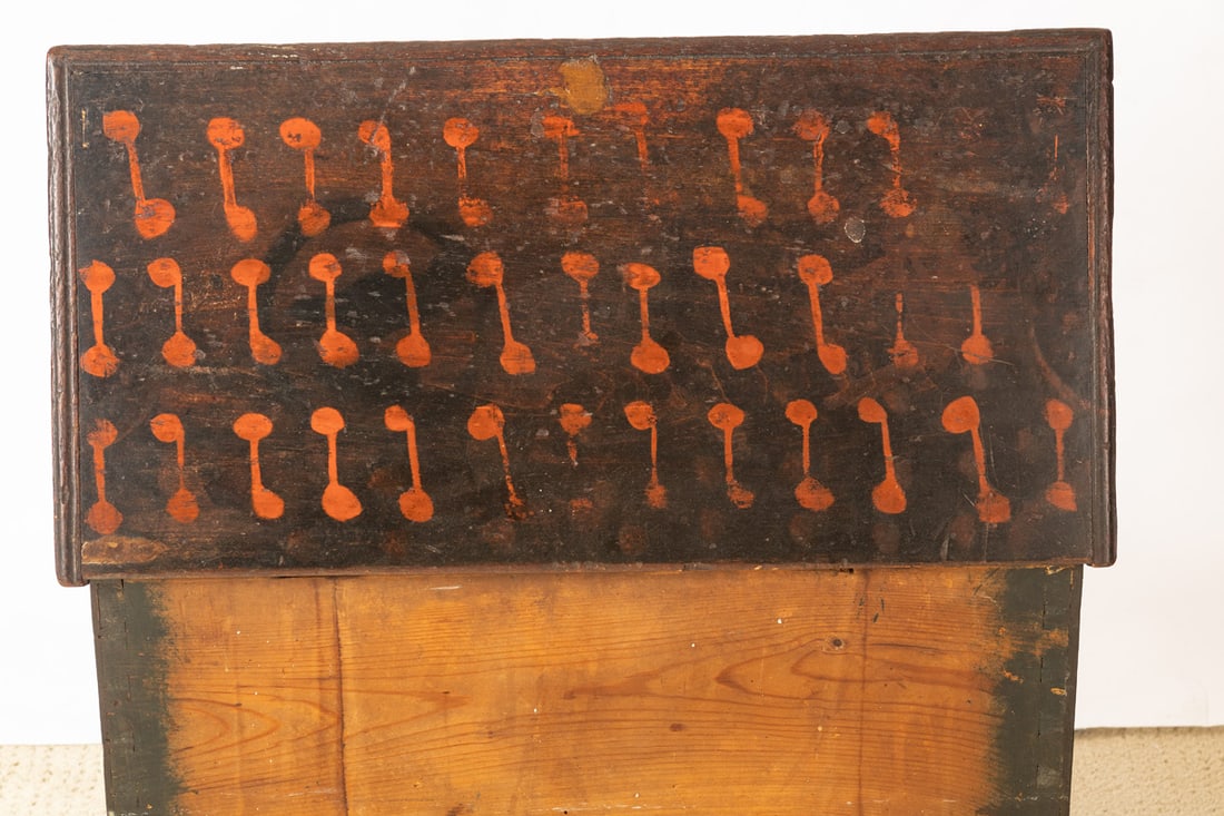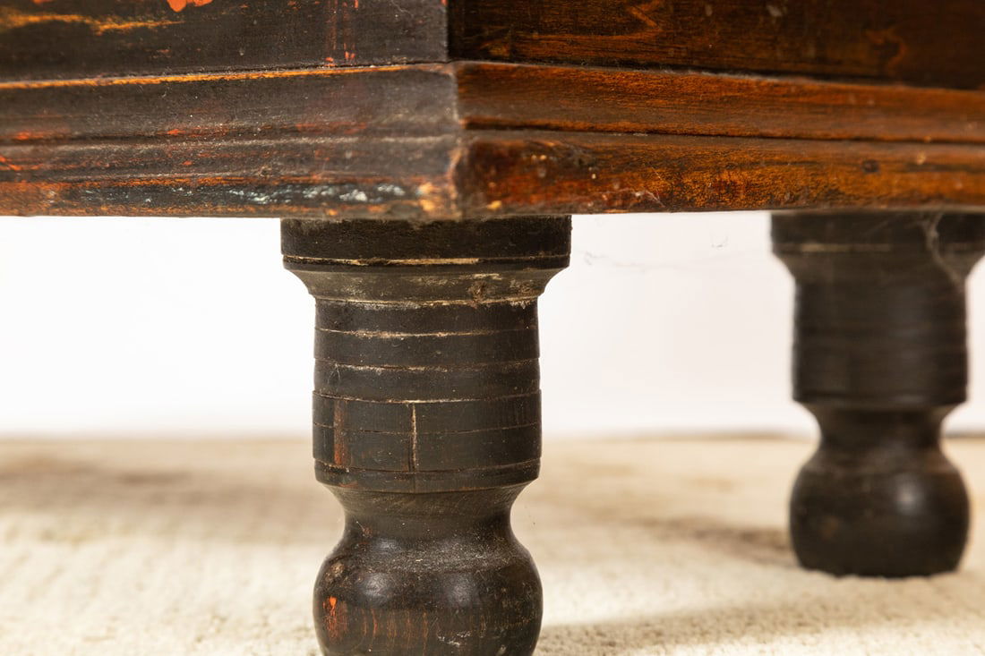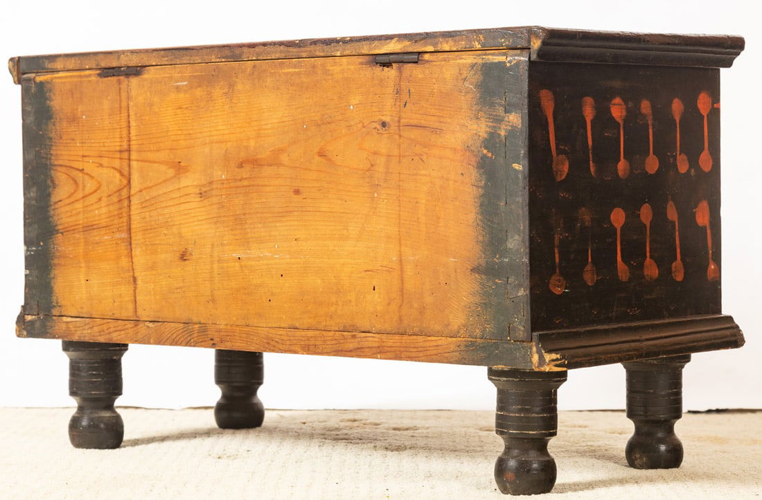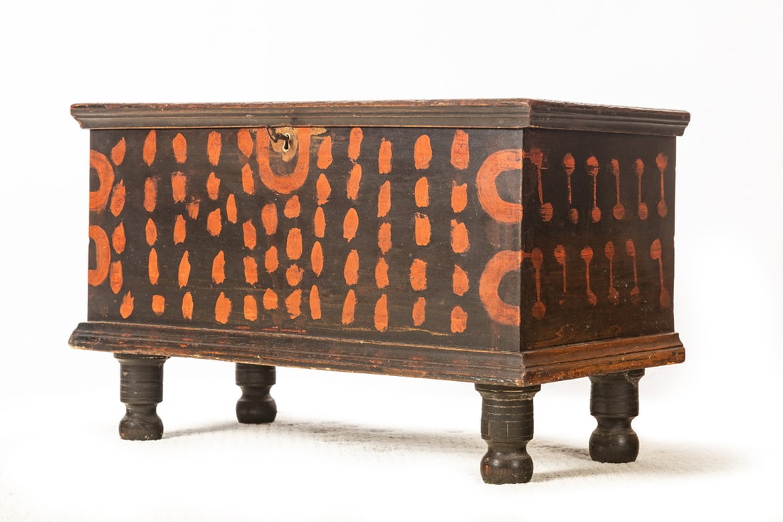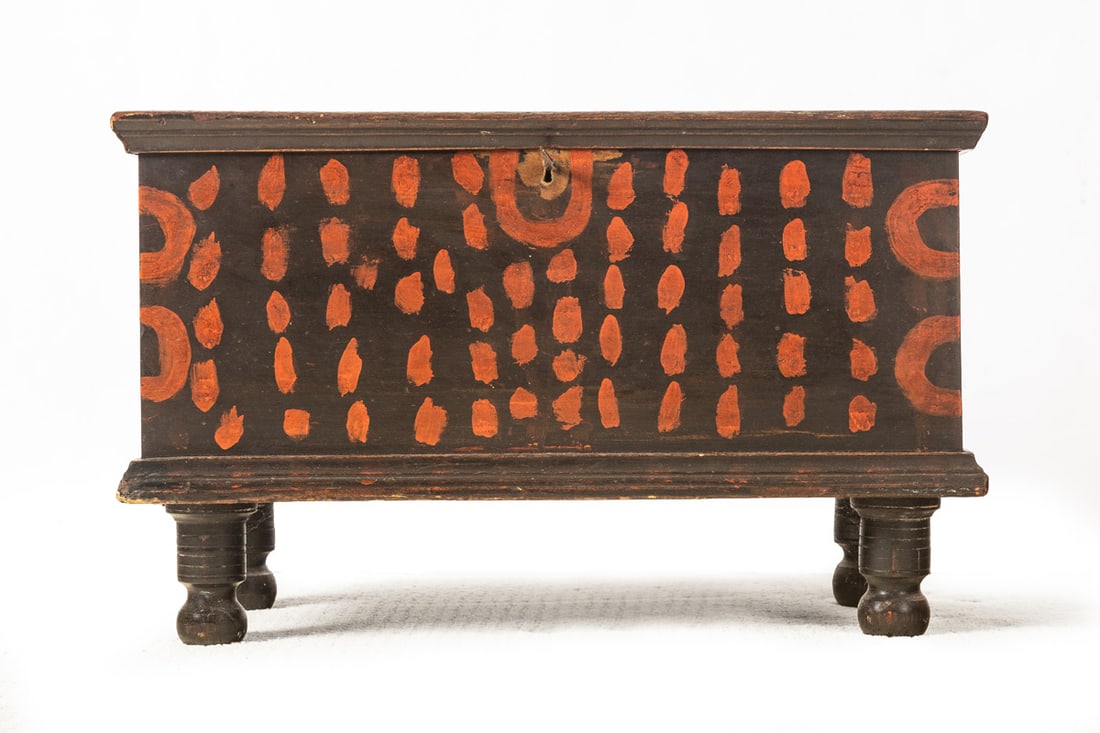 American, 2nd quarter-19th century, pine. Dovetailed case and turned feet, and retaining its original black and red paint decoration. 16" high, 25" wide, 13" deep. Provenance: the collection of the late Jo Louise Brown, Zoar, Ohio. In-house shipping is available for this lot. Please see our terms for details.