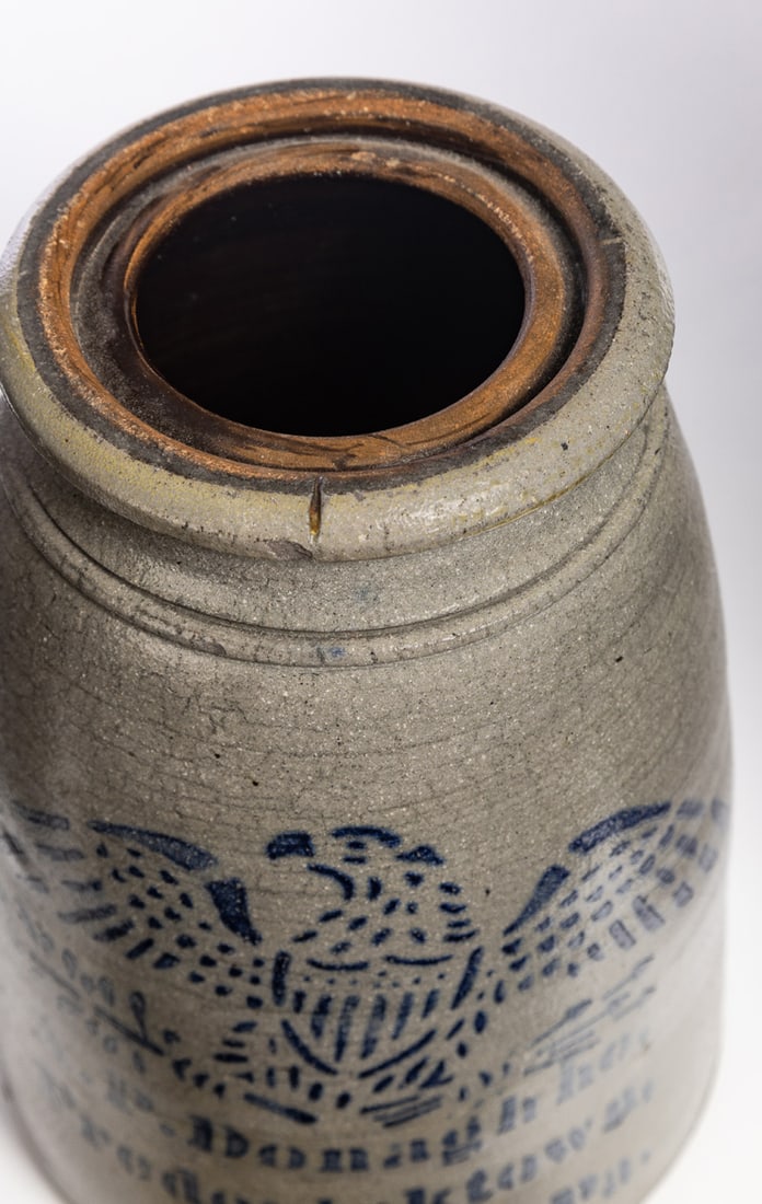 A.P. Donaghho, Fredericktown, Pennsylvania, late 19th century. With stenciled eagle and shield decoration. 10" high. Provenance: the collection of the late Jo Louise Brown, Zoar, Ohio. In-house shipping is available for this lot. Please see our terms for details.
