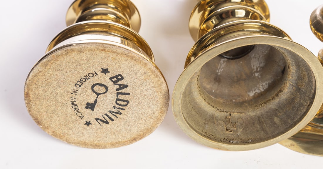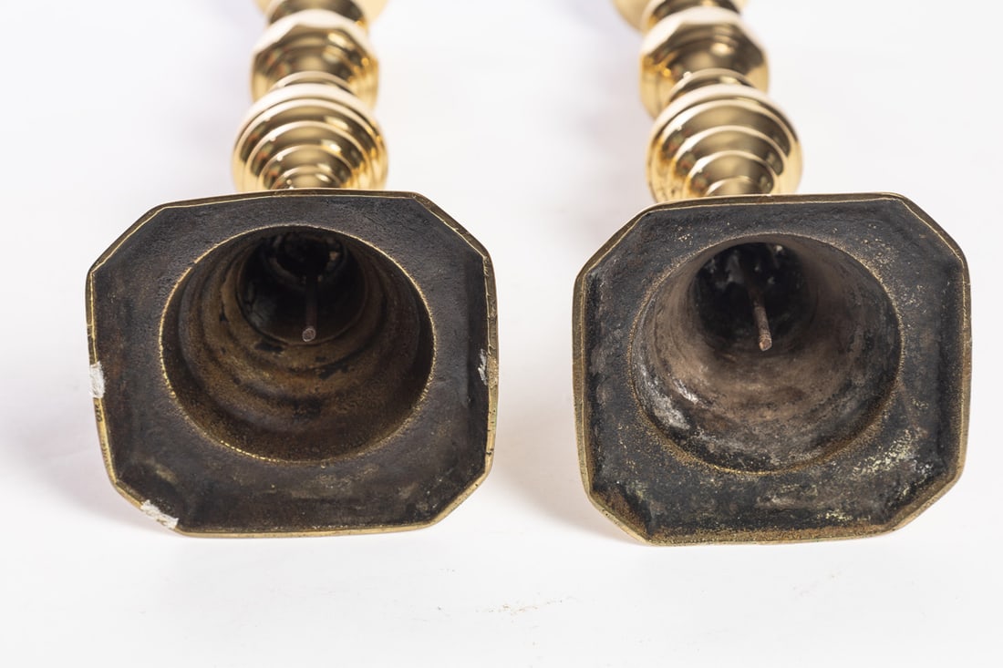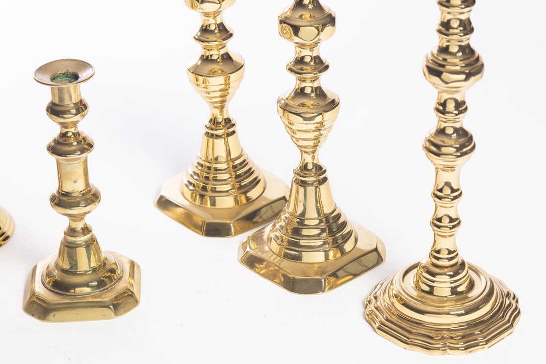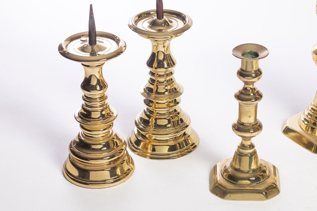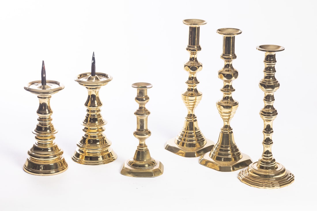 19th-20th century. Includes three Victorian sticks (a pair and a single), and three modern (one of the pricket sticks is Virginia Metalcrafters). Tall pair is 12" high. Provenance: the collection of the late Jo Louise Brown, Zoar, Ohio. In-house shipping is available for this lot. Please see our terms for details.