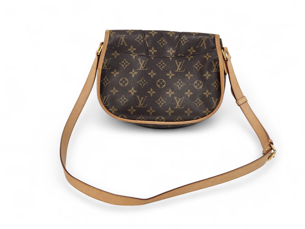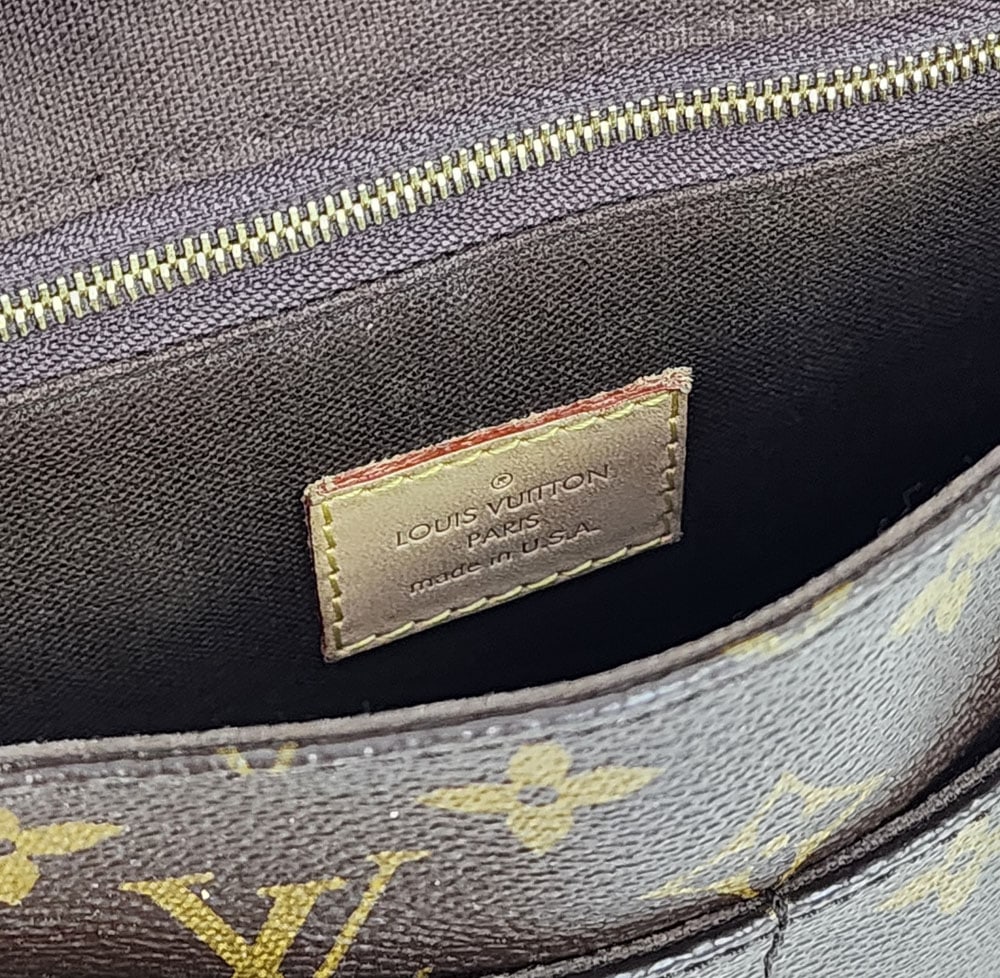 America, 21st century. Made by Marc Jacobs, brown coated canvas, brass hardware, flap closure over two exterior pockets, one interior zippered pockets. 8.5"h. 11"w. 3.5"d.