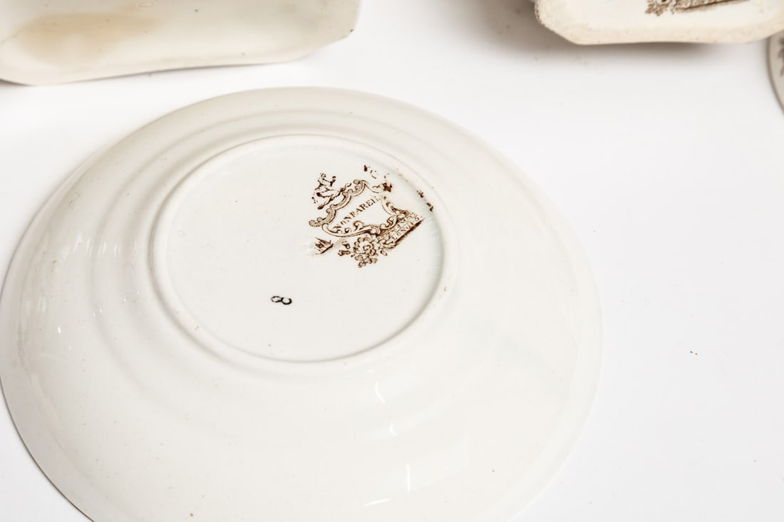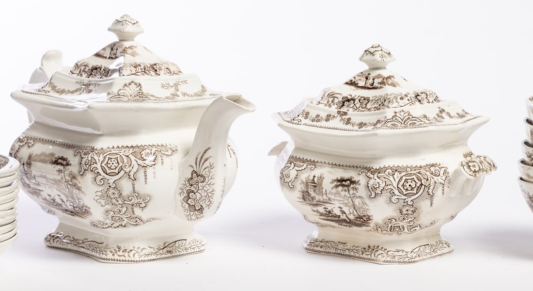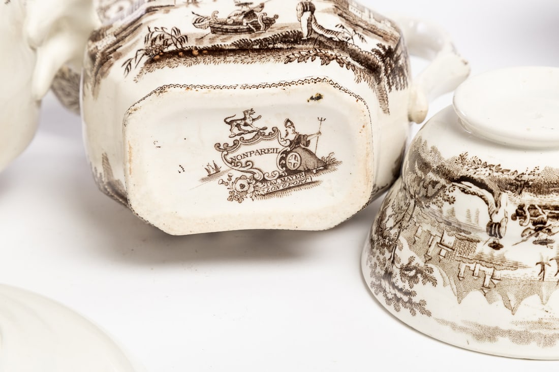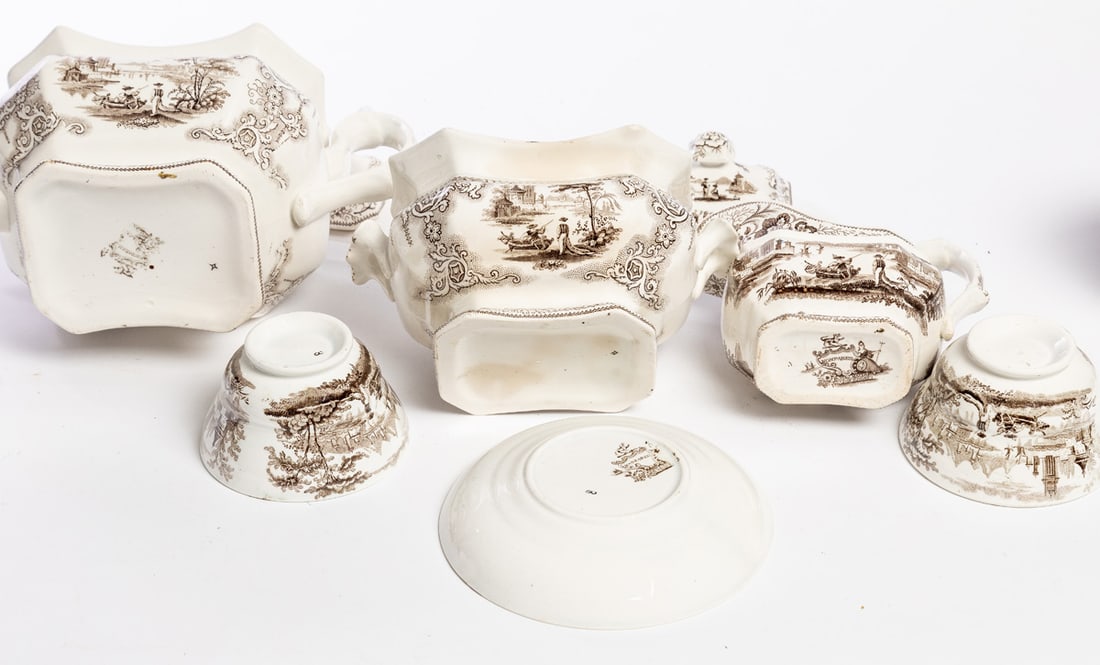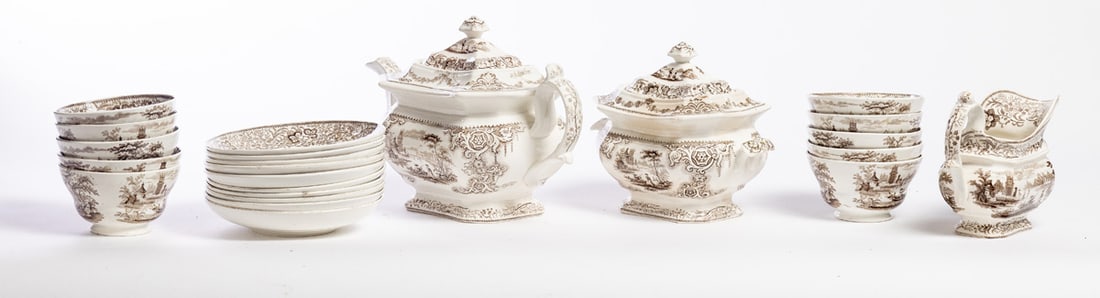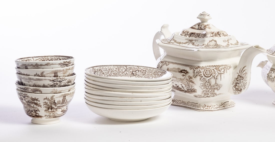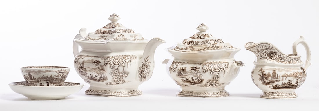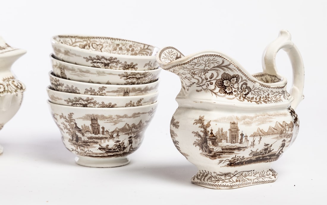 English, mid-19th century, pearlware. Brown transfer in the Nonpariel pattern. Includes teapot, covered sugar bowl, cream pitcher, and ten cups and saucers. Teapot is 6.5" high. Provenance: the collection of the late Jo Louise Brown, Zoar, Ohio. In-house shipping is available for this lot. Please see our terms for details.