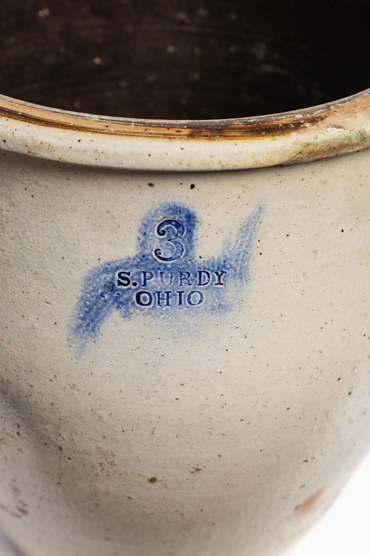North Springfield, Summit County, Ohio, mid-19th century. Three-gallon jug with cobalt-highlighted stamp. 13.5" high. Provenance: the collection of the late Jo Louise Brown, Zoar, Ohio. In-house shipping is available for this lot. Please see our terms for details.