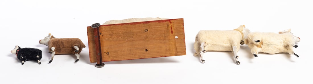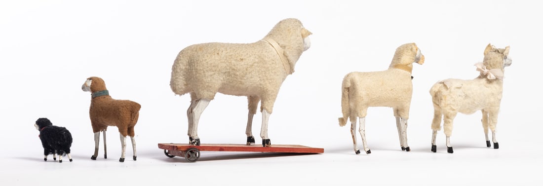 German, late 19th-early 20th century. Includes one pull toy, two adults, and two lambs. 1.5" to 6.5" high. Provenance: the collection of the late Jo Louise Brown, Zoar, Ohio. In-house shipping is available for this lot. Please see our terms for details.