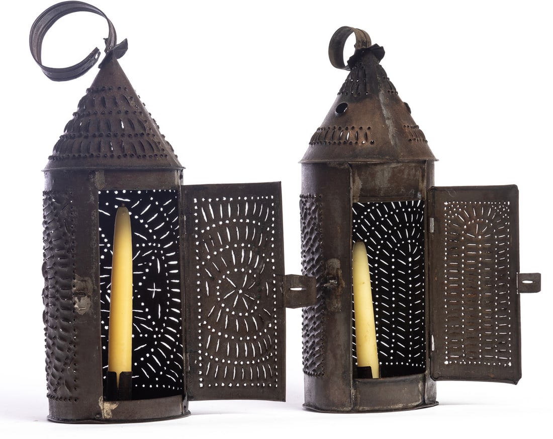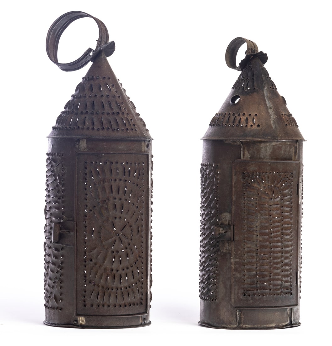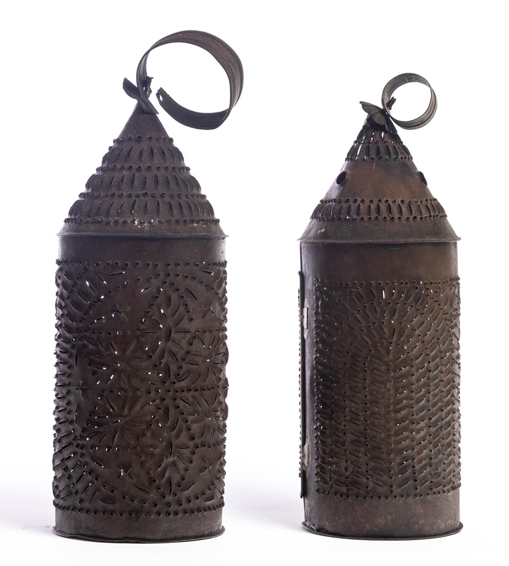 American, 1st half-19th century. Of typical form with elaborately punched decoration. 14" and 15" high (excluding hanging rings). Provenance: the collection of the late Jo Louise Brown, Zoar, Ohio. In-house shipping is available for this lot. Please see our terms for details.
