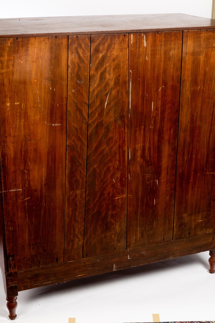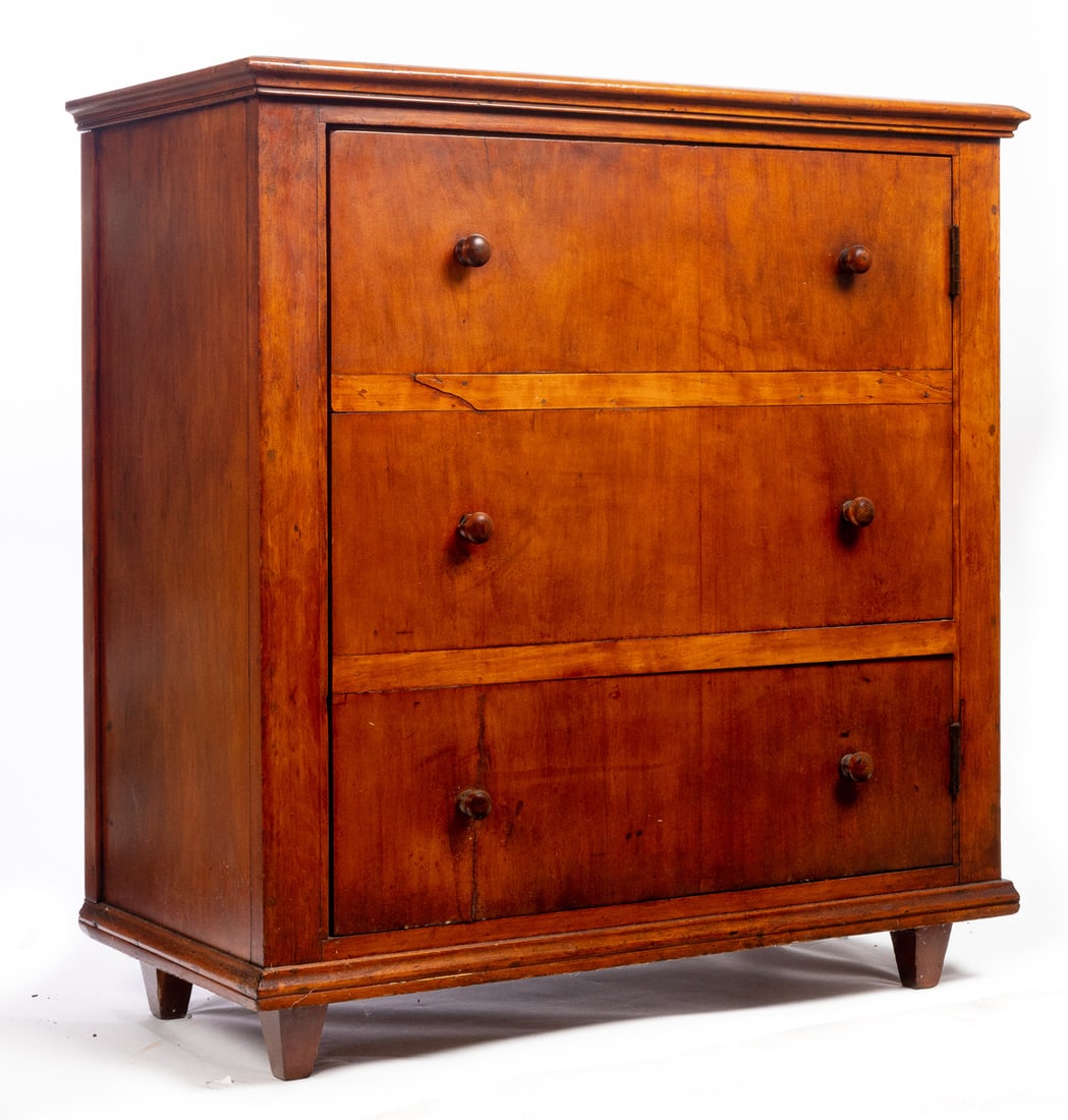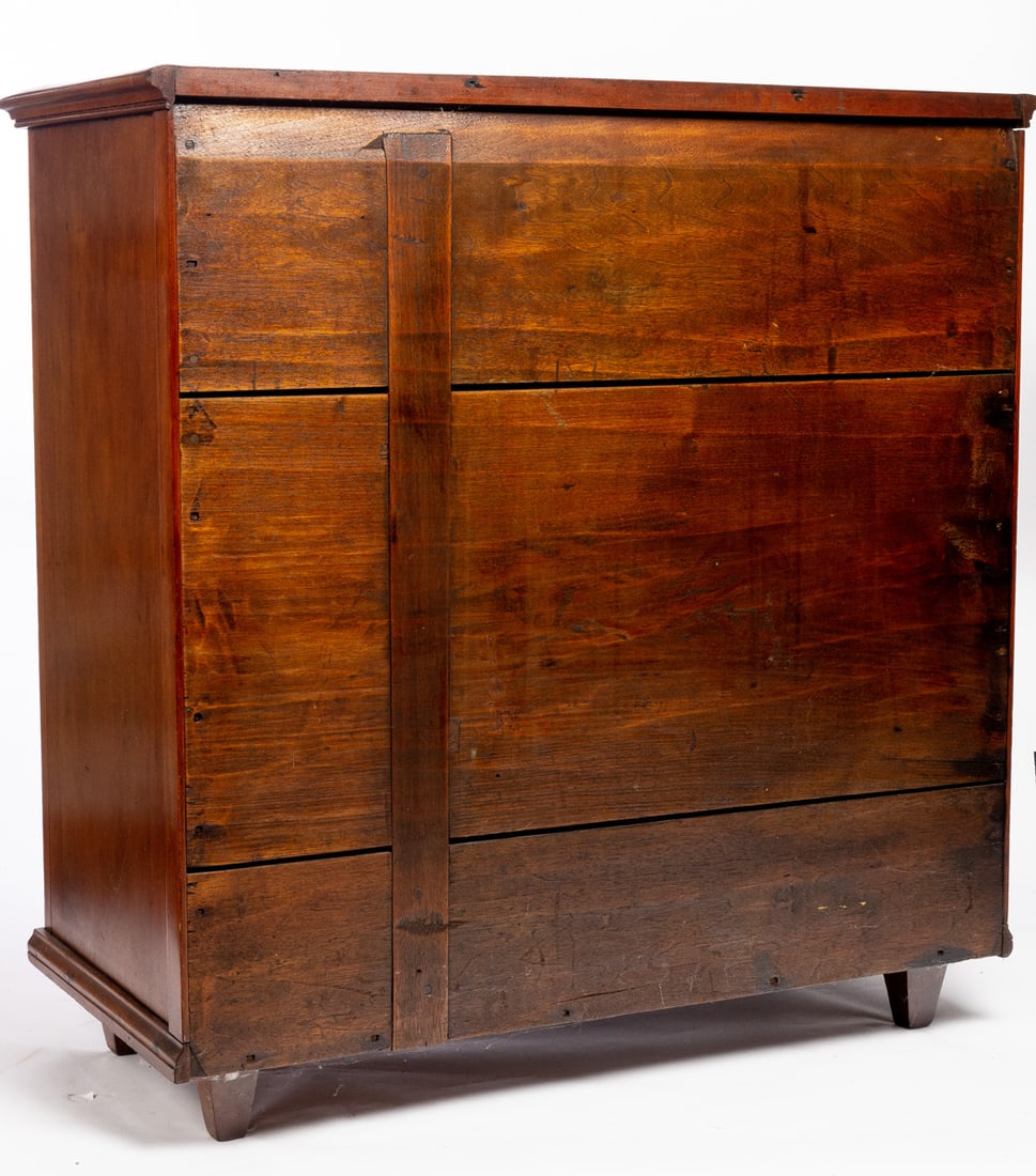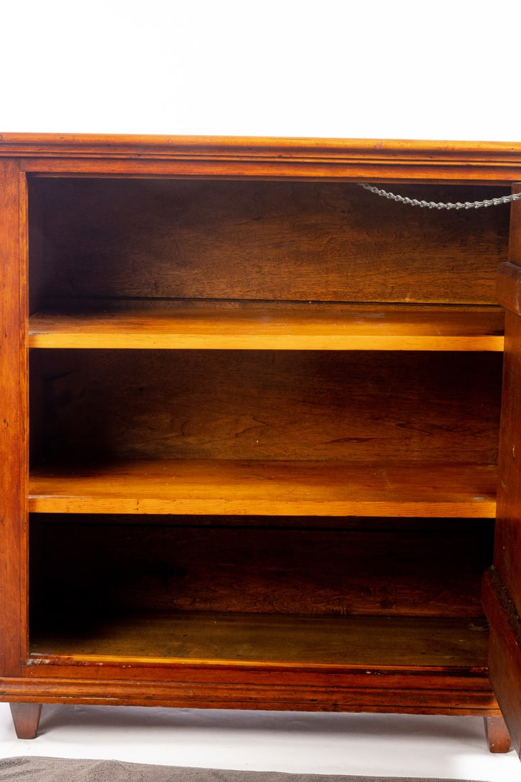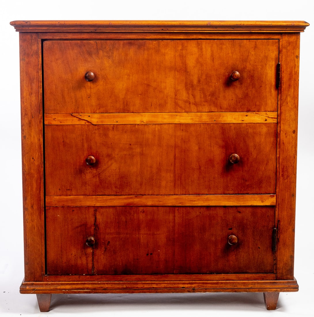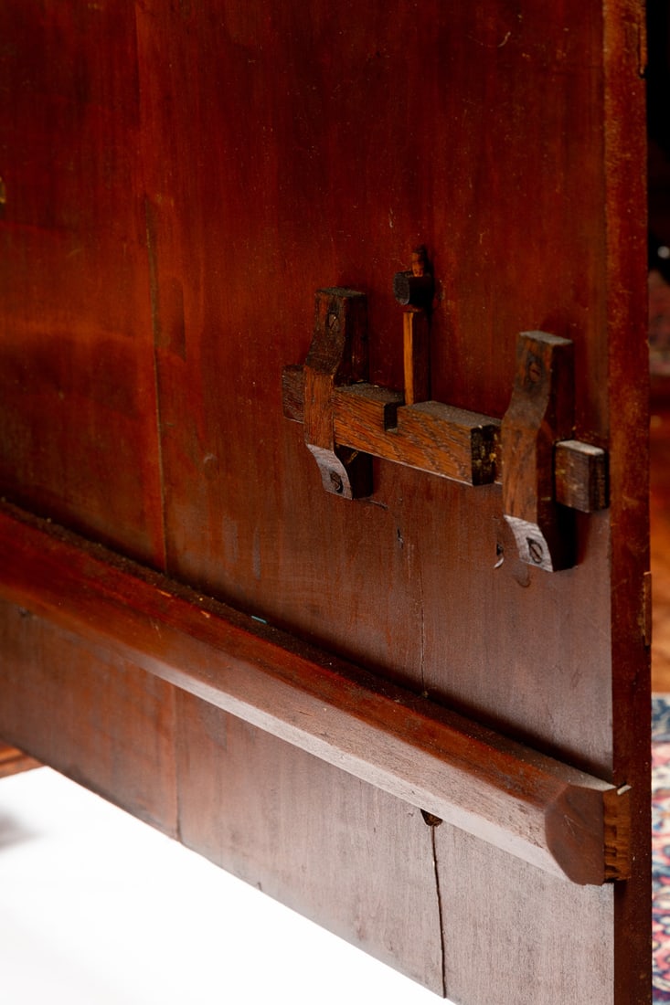 3rd quarter-19th century, cherry and walnut. Low cupboard, the door with faux drawers on the front, and an unusual latching mechanism on the inside. 32.75" high, 31.5" wide, 15.5" deep. Purchased from Thelma Harding (Newcomerstown, Ohio) in 1960, and was, at that time, attibuted to Zoar. Provenance: the collection of the late Jo Louise Brown, Zoar, Ohio. Pickup or freight shipping is required for this lot. Please see our terms for details.