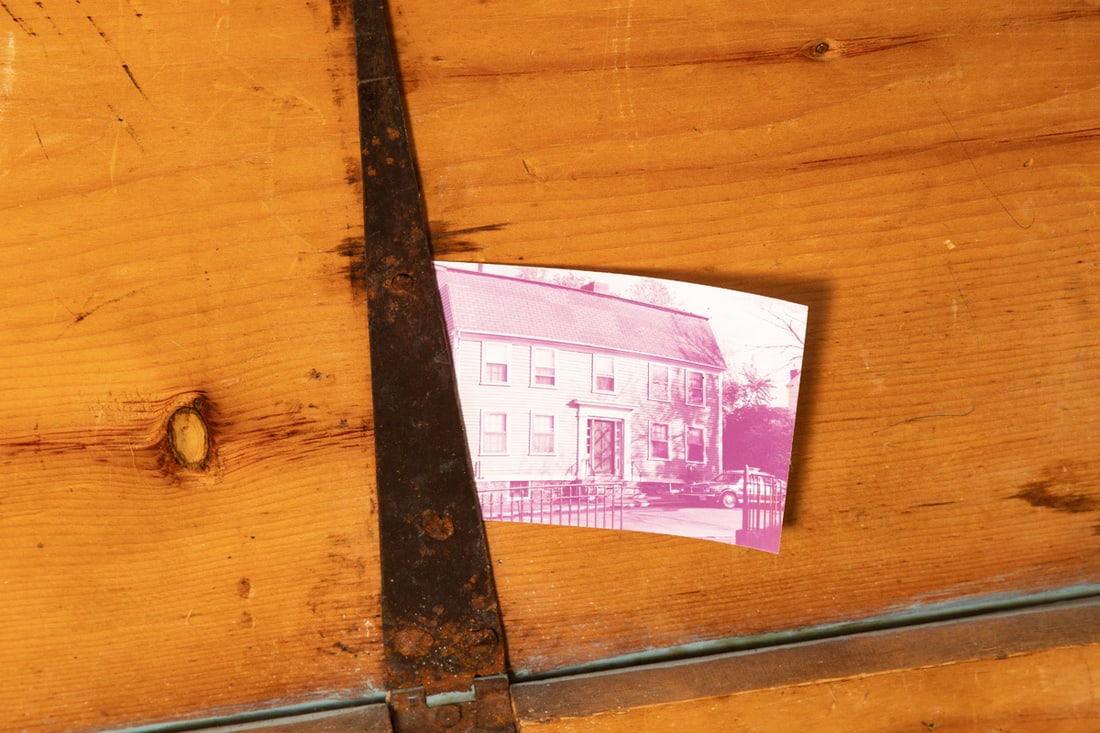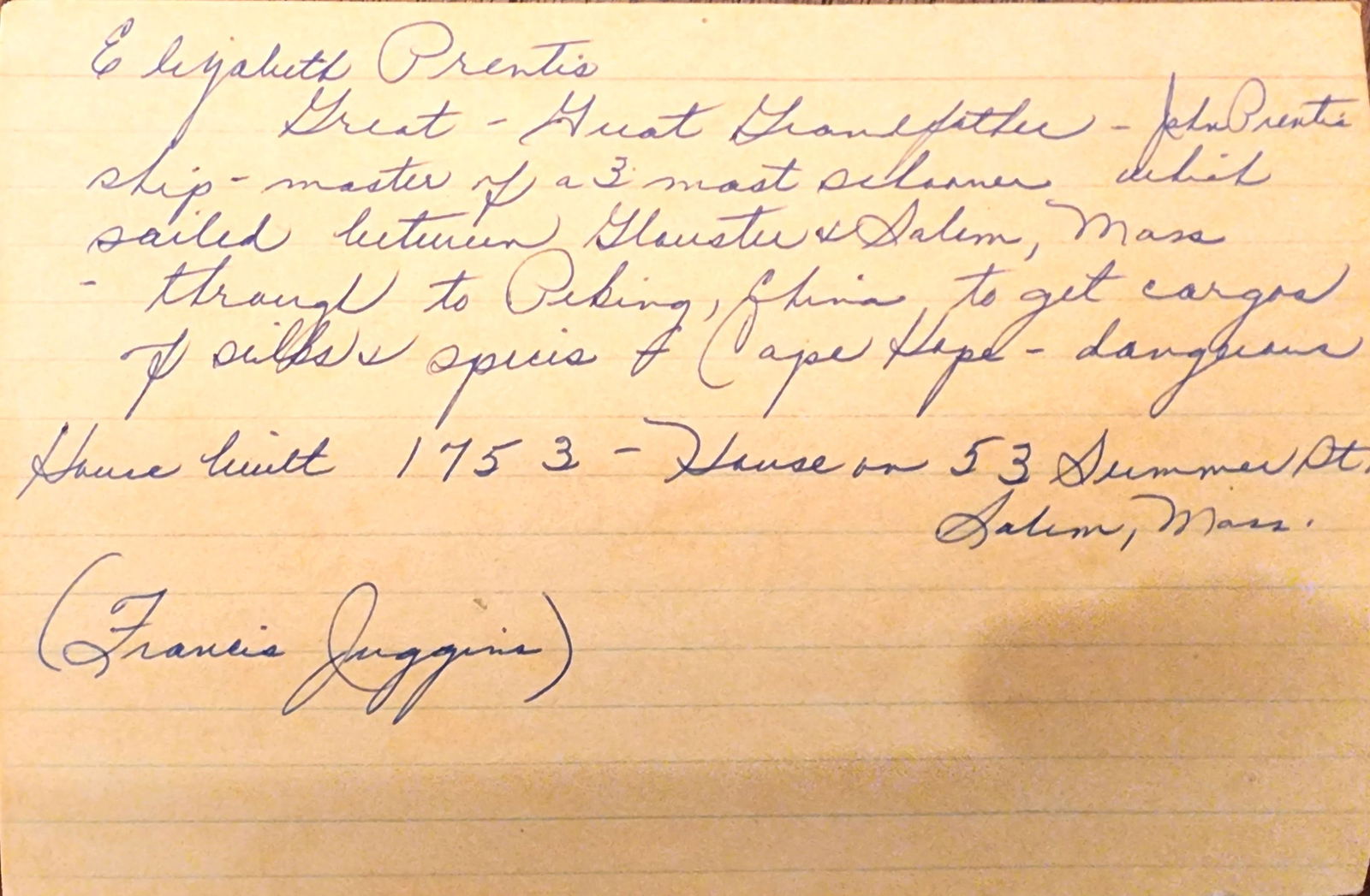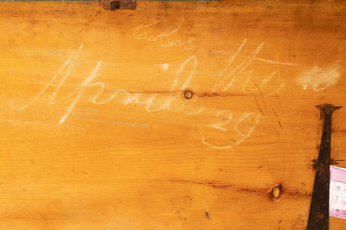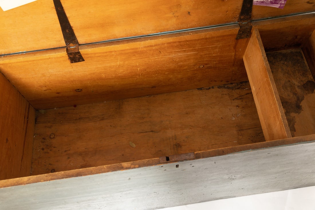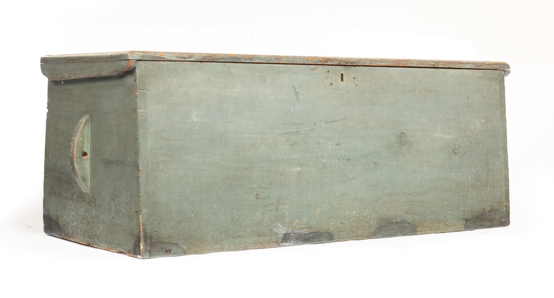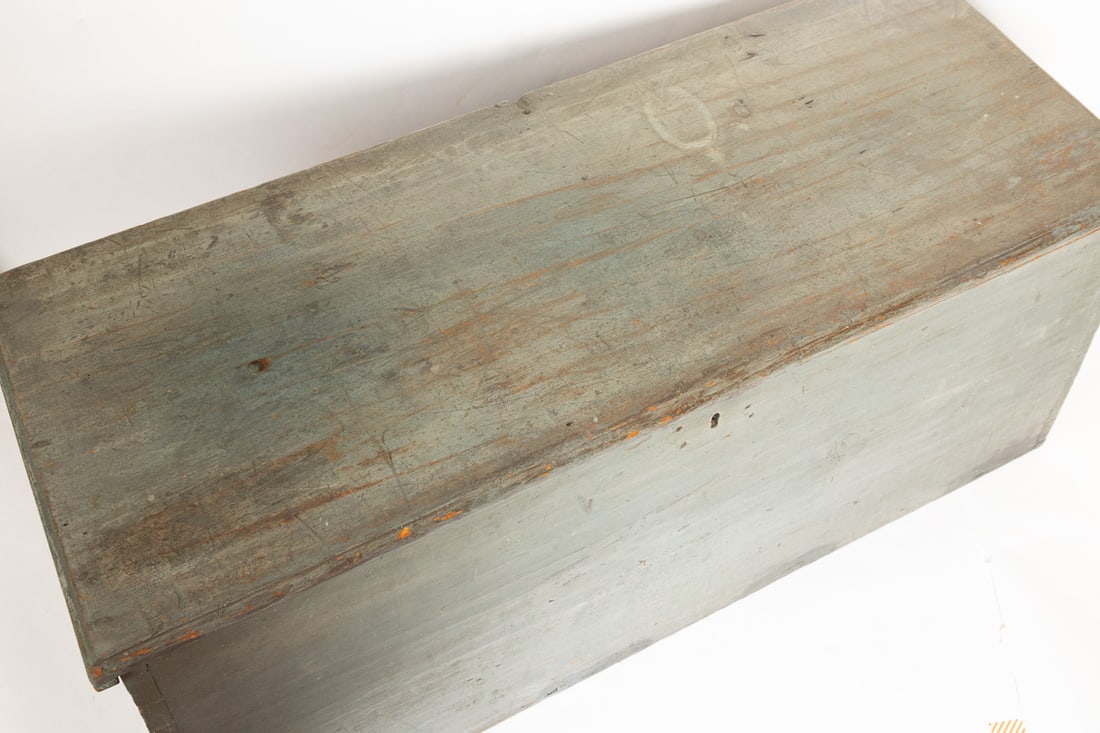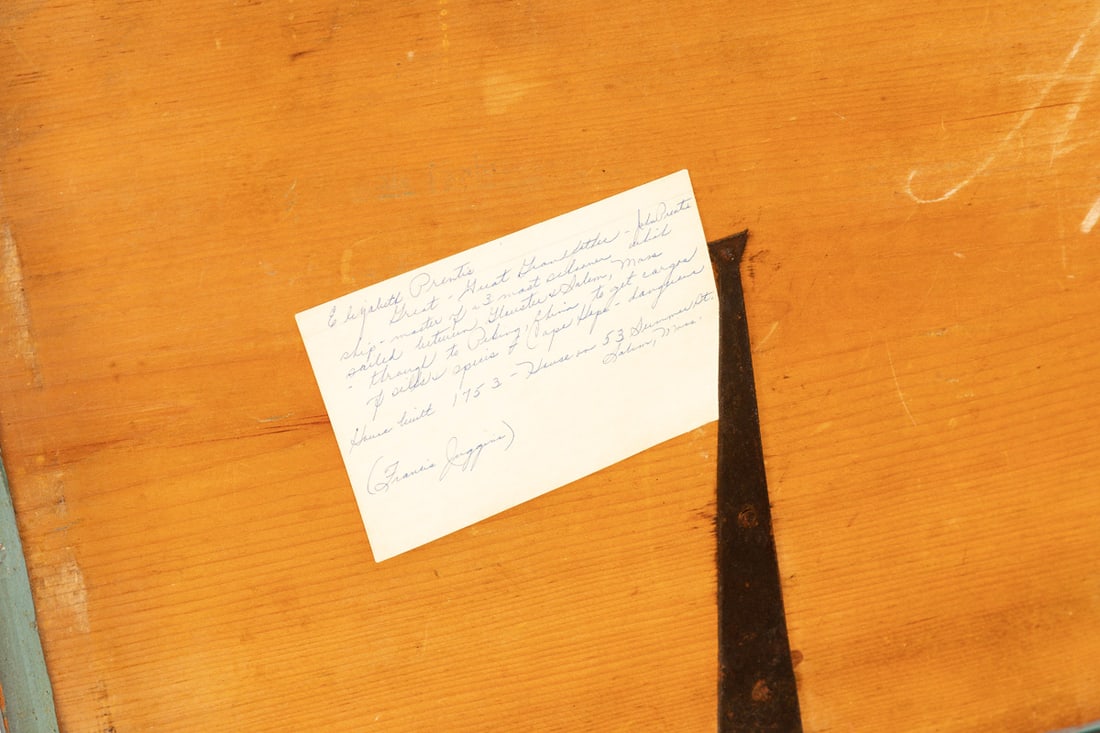 Salem, appears to be dated April 10, 1829, pine. Six-board, dovetailed chest with canded sides, beckets, original "fish tail" strap hinges, and old blue paint. 17" high, 44.5" wide, 16.5" deep. Salem, appears to be dated April 10, 1829, pine. Six-board, dovetailed chest with canted sides, beckets, original "fish tail" strap hinges, and old blue paint. 17" high, 44.5" wide, 16.5" deep. According to Mrs. Brown’s notes, this chest was originally owned by a ship master ?John Prentis, ? and was purchased out of a "1753 house at 53 Summer St. Salem, Mass." As is often the case, the information is not entirely accurate, but has some factual information. The house at 53 Summer Street in Salem was actually built in 1756, and it still stands today (recently fully restored). There was a ship captain named John Bubier Prentiss (1770-1817) who sailed out of nearby Marblehead (he was one of many sea faring Prentisses in Marblehead), but we could find no connection between the Prentiss family and 53 Summer St. We did, however, find a John Preston (1821-1891), a baker, who did reside at 53 Summer St. More research may untangle the Prentiss-Preston connection to this chest, but we are fairly certain that the chest was owned by Francis Juggins Jr. (1907-1986), the son of a prominent Boston attorney. In Francis Jr.?s later life, he moved to Tuscarawas County, Ohio. We believe he acquired this chest, as well as the card table also in this auction, from 53 Summer St., and then brought it to Ohio, and Mrs. Brown ultimately acquired it from him or his estate. Provenance: the collection of the late Jo Louise Brown, Zoar, Ohio. Pickup or freight shipping is required for this lot. Please see our terms for details.