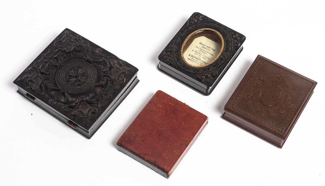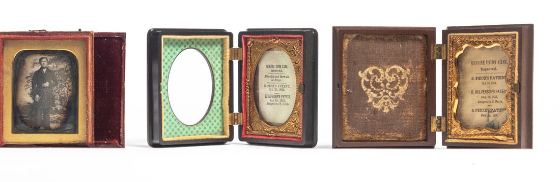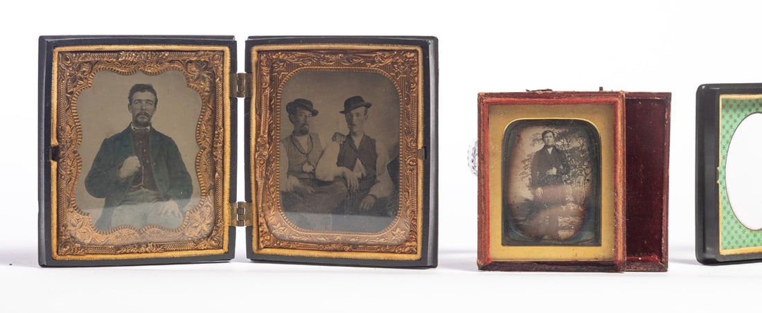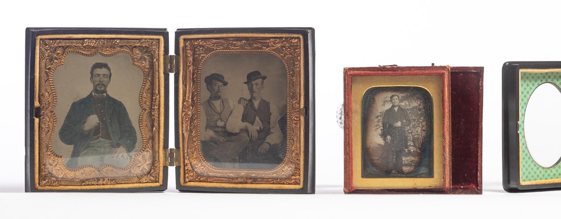 American, mid-19th century. Includes a ninth plate daguerreotype of a standing gentleman, two ninth plate union cases, and a sixth plate union case currently housing a tinted tintype of a seated gentleman and a tintype of a couple of dandies. Provenance: the collection of the late Jo Louise Brown, Zoar, Ohio. In-house shipping is available for this lot. Please see our terms for details.