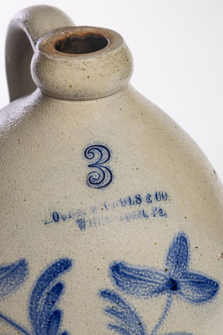 Williamsport, Pennslyvania, late 19th century. Three-gallon jug with floral decoration. 15" high. Provenance: the collection of the late Jo Louise Brown, Zoar, Ohio. In-house shipping is available for this lot. Please see our terms for details.