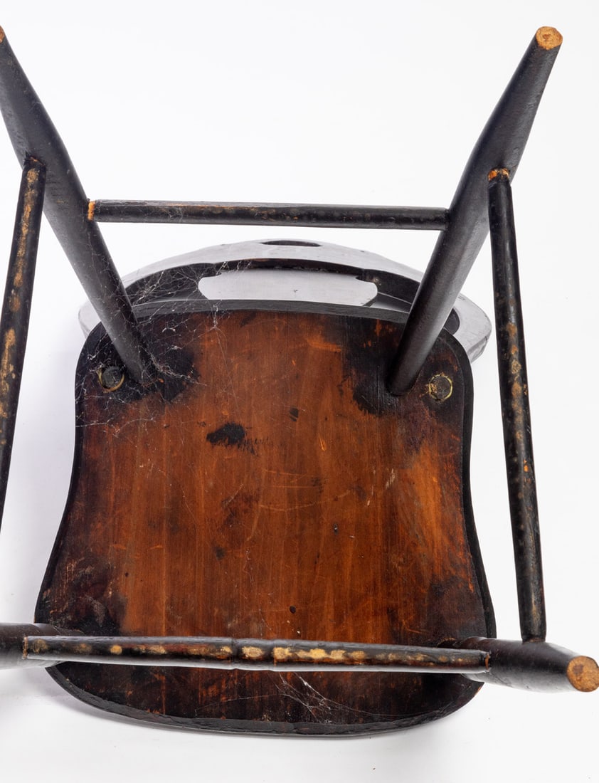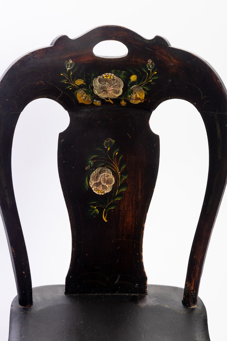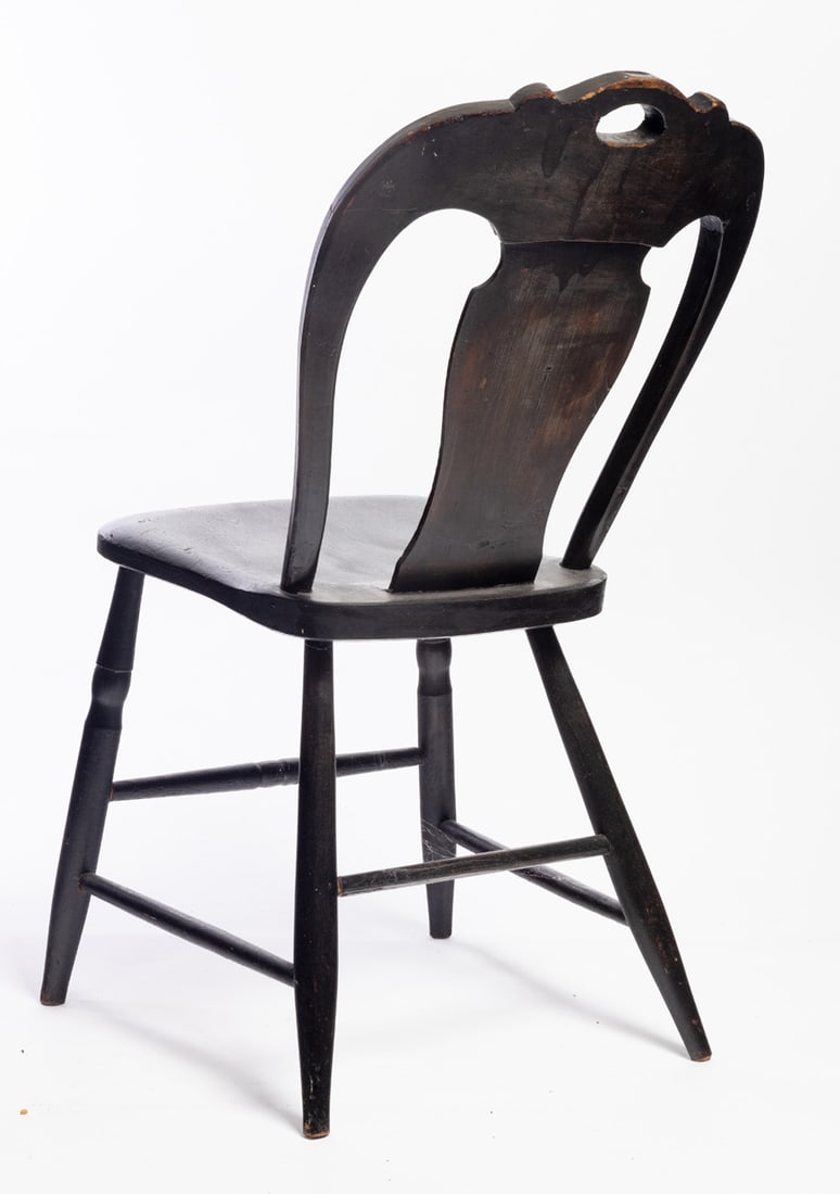 Tuscarawas County, mid-19th century, mixed woods. Balloon-back with original floral decoration. 31.5" high. This type of chair has long been associated with Zoar. They were likely made locally and sold to the Zoar community. In Snyder, Goudy, and Goudy’s Zoar Furniture, they illustrated several examples, including some marked for Uhrichsville maker J. Hicks. Provenance: the collection of the late Jo Louise Brown, Zoar, Ohio. Pickup or freight shipping is required for this lot. Please see our terms for details.