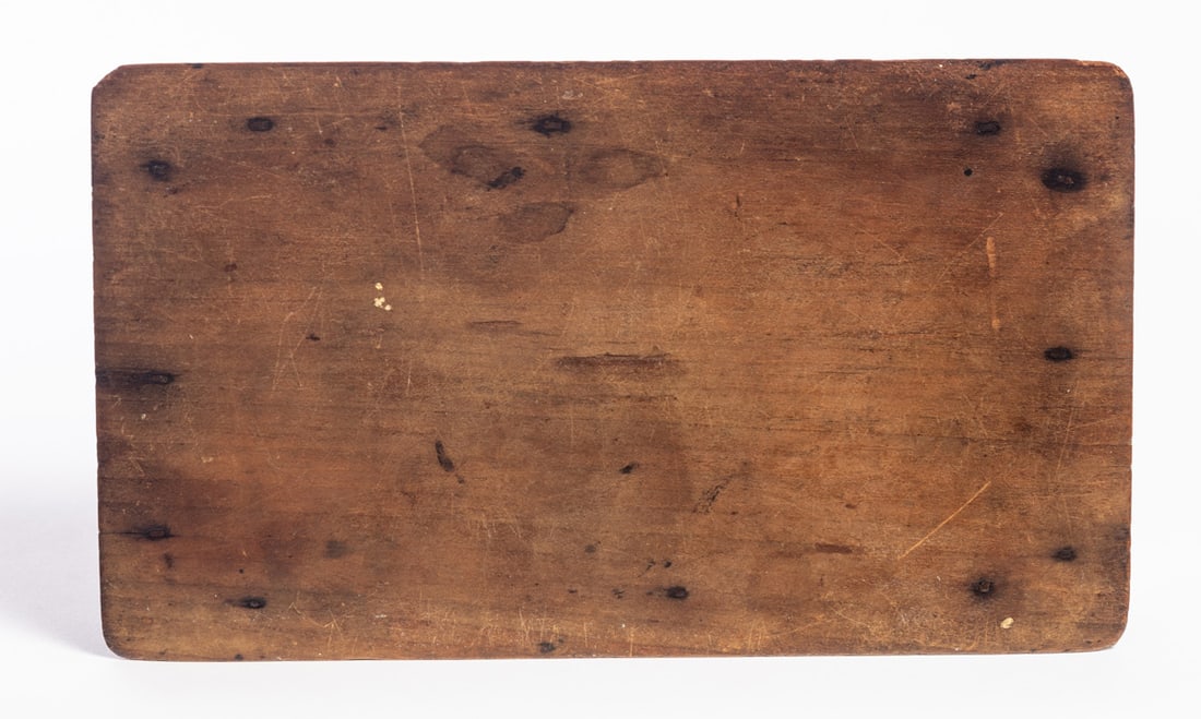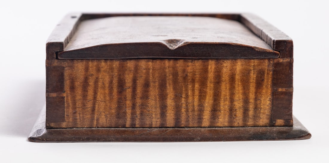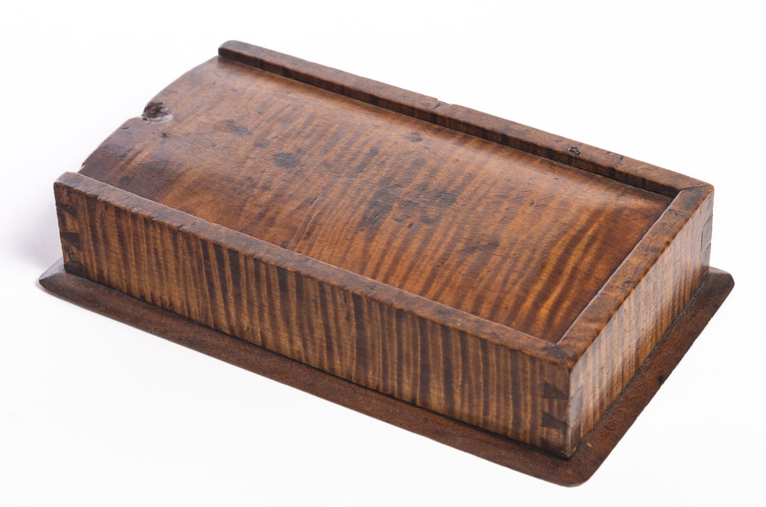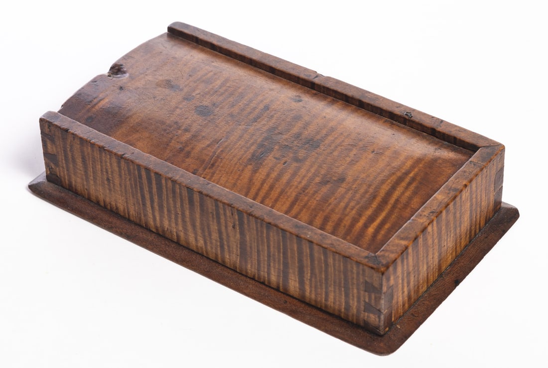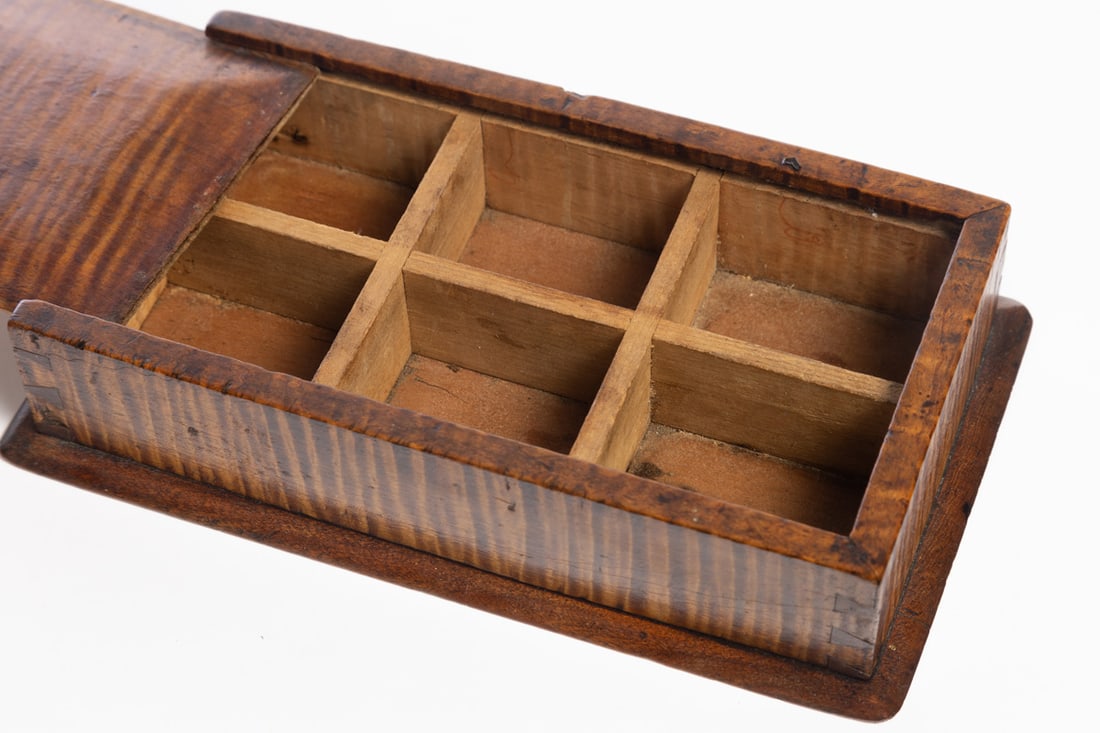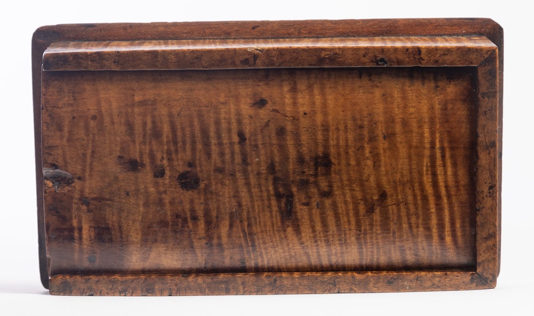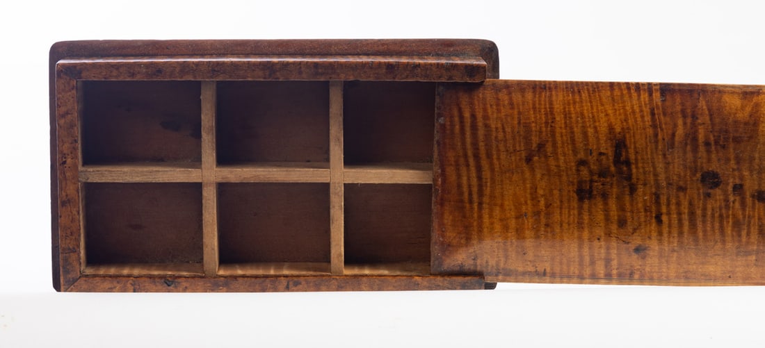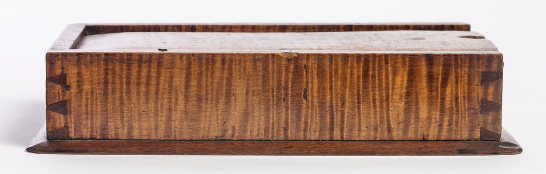 American, 1st half-19th century, curly maple and poplar. Diminutive dovetailed box with a sliding lid; the interior compartment is divided. 2" high, 5.5" wide, 9.75" long. Provenance: the collection of the late Jo Louise Brown, Zoar, Ohio. In-house shipping is available for this lot. Please see our terms for details.