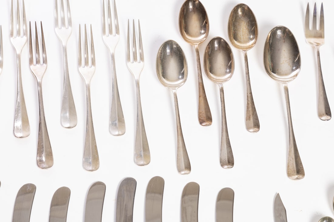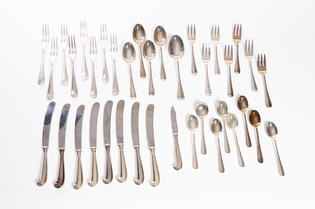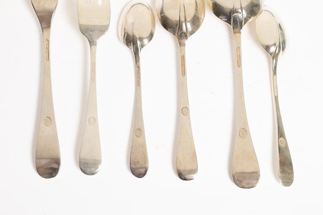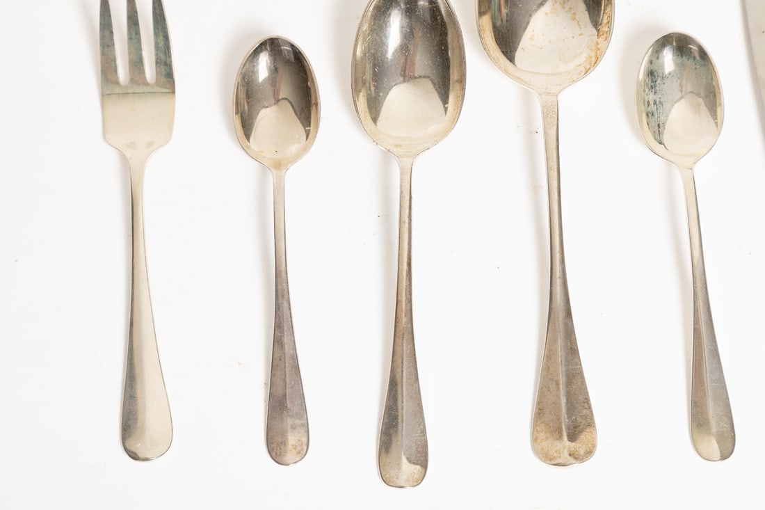 Stieff. Service for eight, includes dinner forks, salad forks (7), teaspoons (7), table knives, soup spoons (4), tablespoon (1), cream soup spoon (1), and small knife (1). Total weight approx. 1340g. (excluding hollow-handled pieces). Provenance: the collection of the late Jo Louise Brown, Zoar, Ohio. In-house shipping is available for this lot. Please see our terms for details.