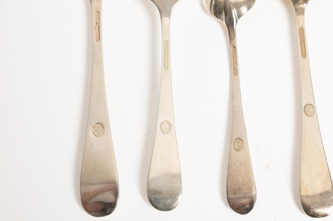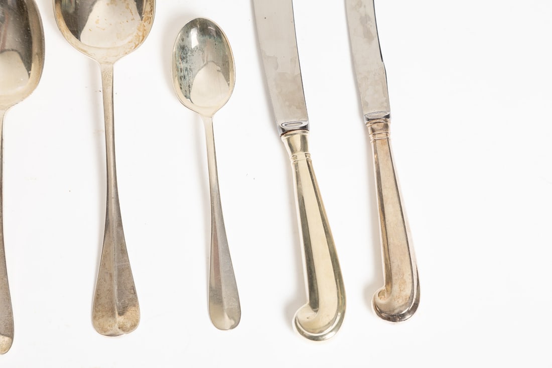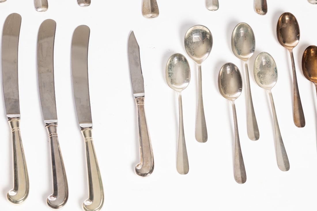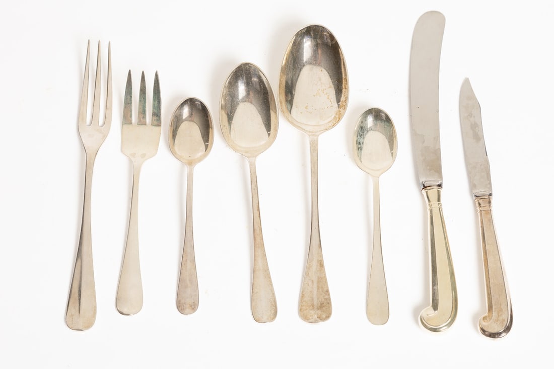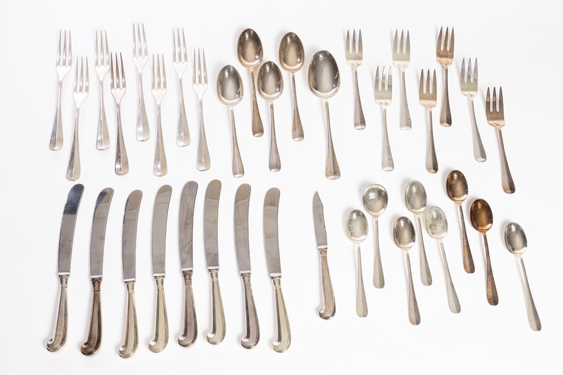 Stieff. Service for eight, includes dinner forks, salad forks (7), teaspoons (7), table knives, soup spoons (4), tablespoon (1), cream soup spoon (1), and small knife (1). Total weight approx. 1340g. (excluding hollow-handled pieces). Provenance: the collection of the late Jo Louise Brown, Zoar, Ohio. In-house shipping is available for this lot. Please see our terms for details.