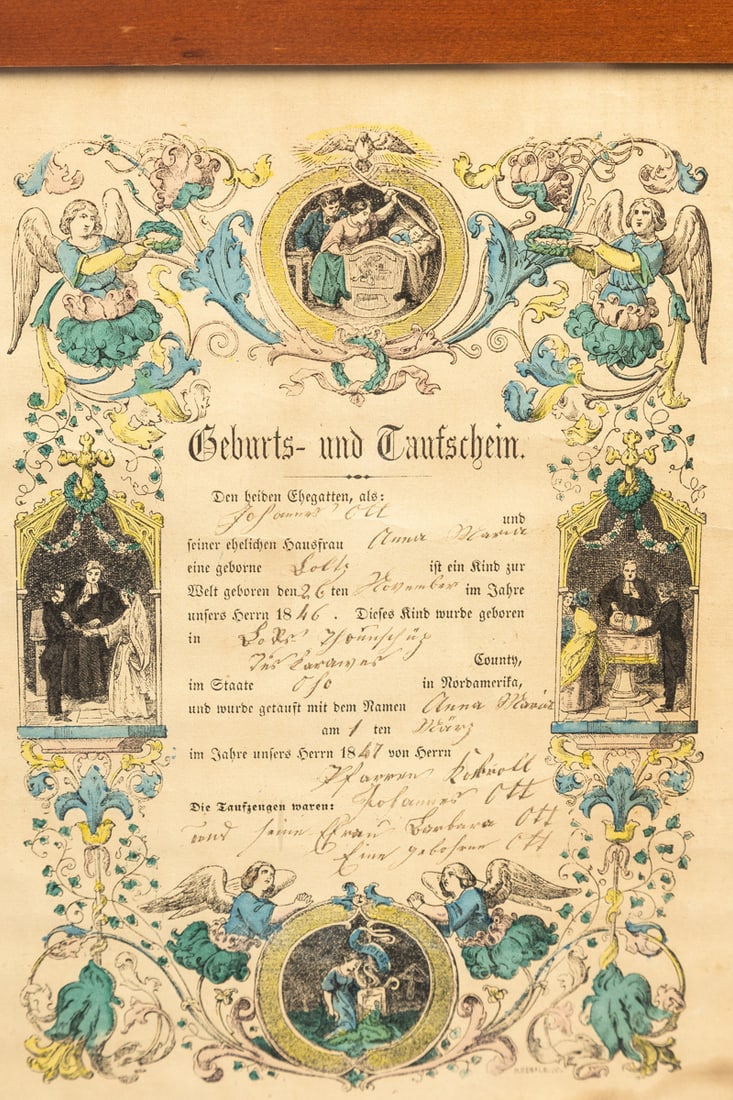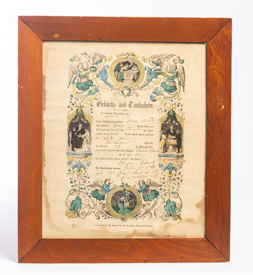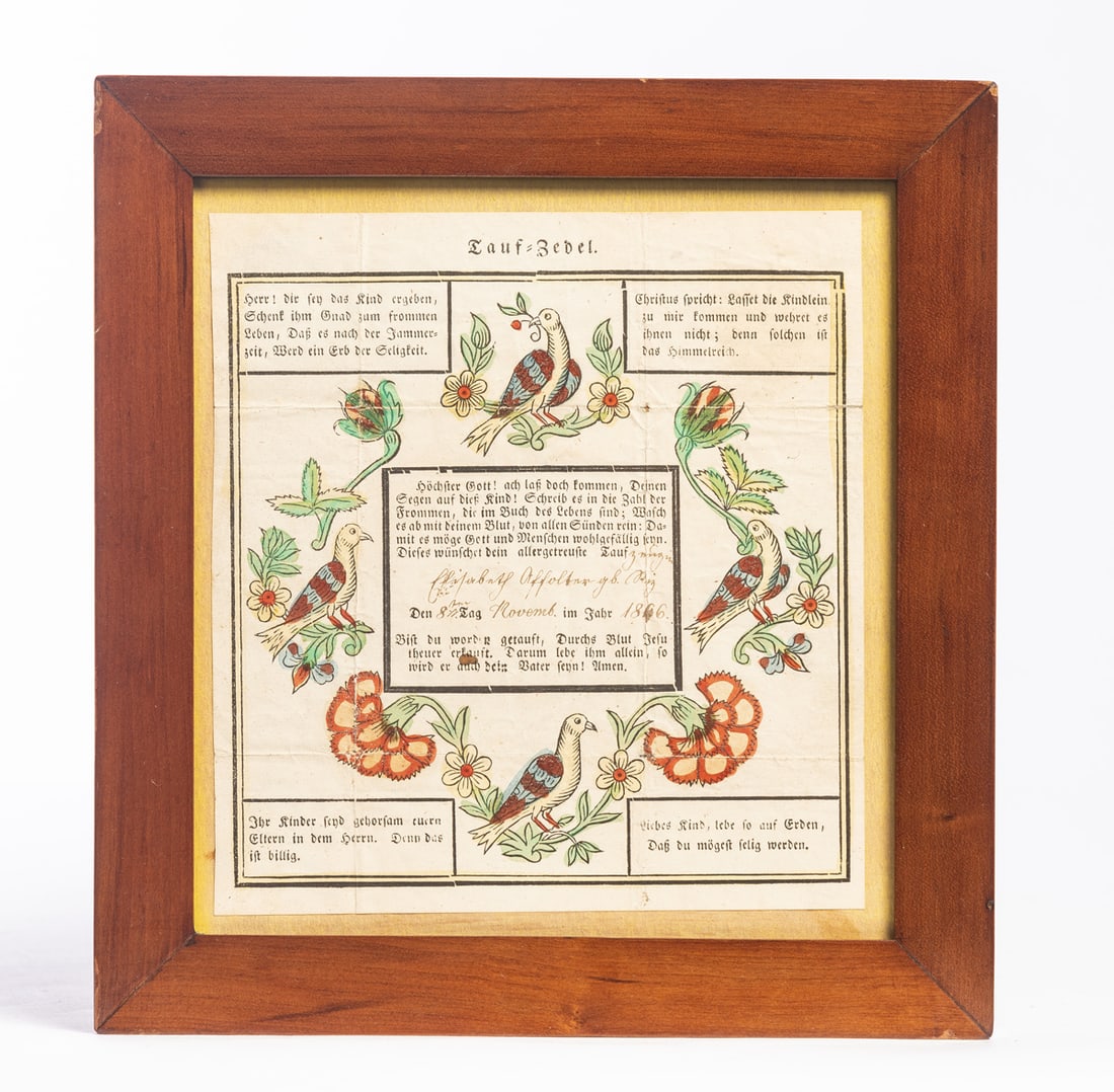 Tuscarawas County, mid-19th century. Each handcolored and completed in ink. One is for Anna Mary Boltz, born in November of 1846 to Johannes Ott and Anna Maria Boltz. The other is for Elizabeth Affolter. Framed, 14.25" high, 12.25" wide and 9.75" high, 9.25" wide (overall). Provenance: the collection of the late Jo Louise Brown, Zoar, Ohio. In-house shipping is available for this lot. Please see our terms for details.