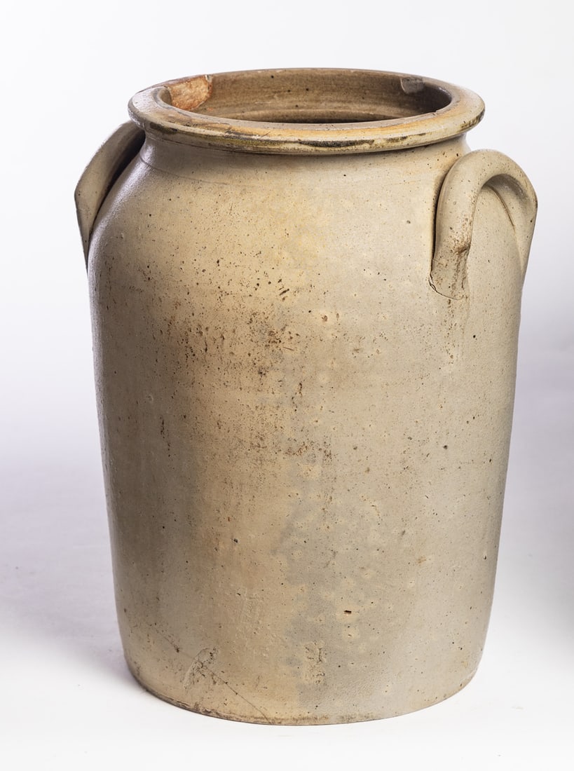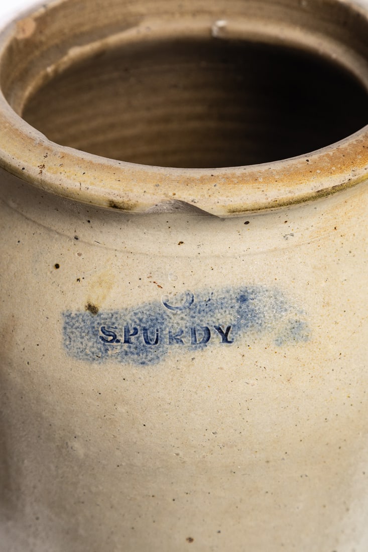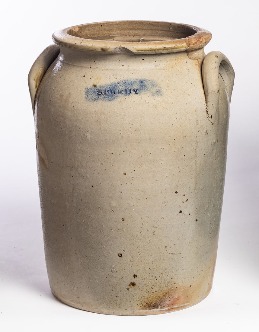 North Springfield, Summit County, Ohio, mid-19th century. Three-gallon crock with cobalt-highlighted stamp. 11.5" high. Provenance: the collection of the late Jo Louise Brown, Zoar, Ohio. In-house shipping is available for this lot. Please see our terms for details.