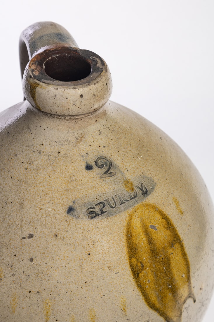 North Springfield, Summit County, Ohio, mid-19th century. Two-gallon jug with cobalt-highlighted stamp. 12" high. Provenance: the collection of the late Jo Louise Brown, Zoar, Ohio. In-house shipping is available for this lot. Please see our terms for details.