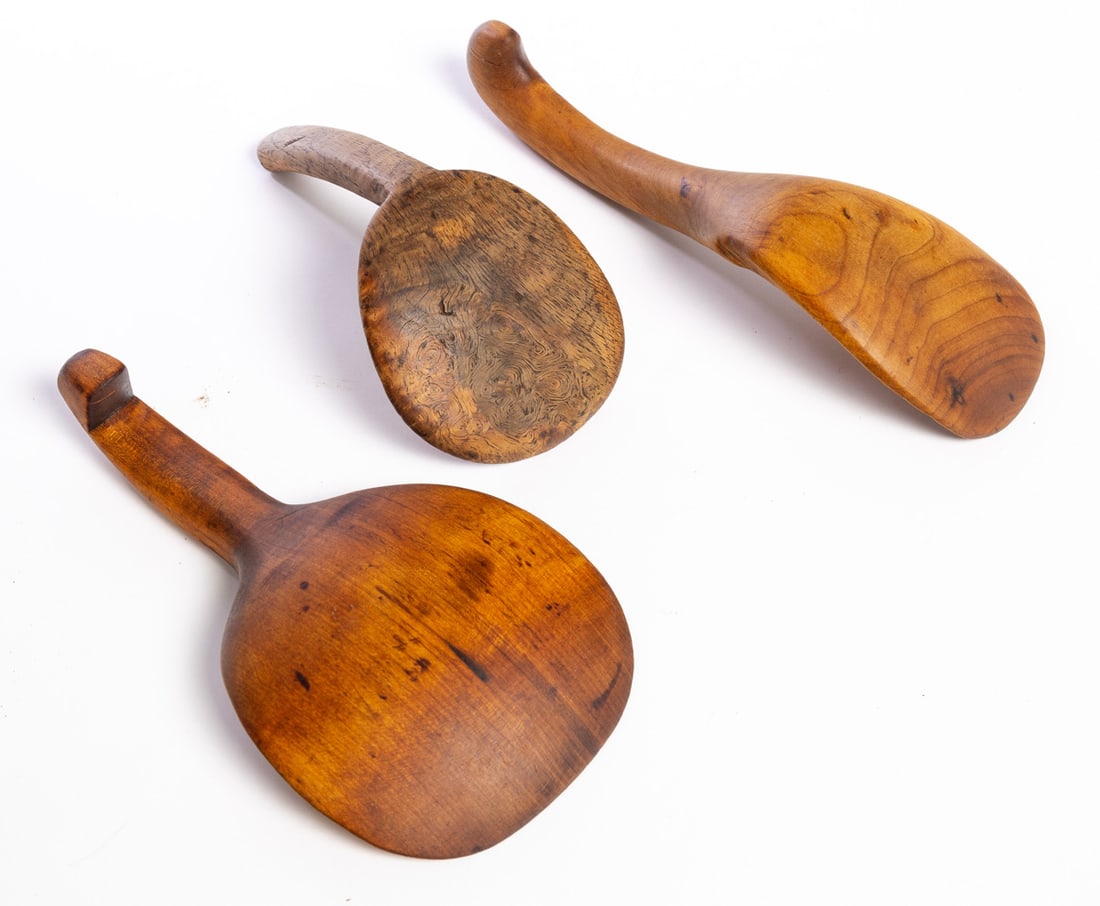 American, 19th century. Two are maple and have carved finials, and one is burl. 7" to 10" long. Provenance: the collection of the late Jo Louise Brown, Zoar, Ohio. In-house shipping is available for this lot. Please see our terms for details.
