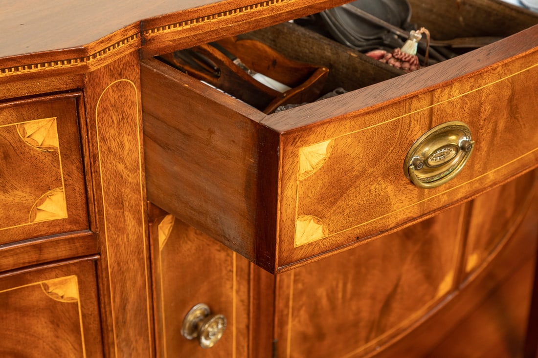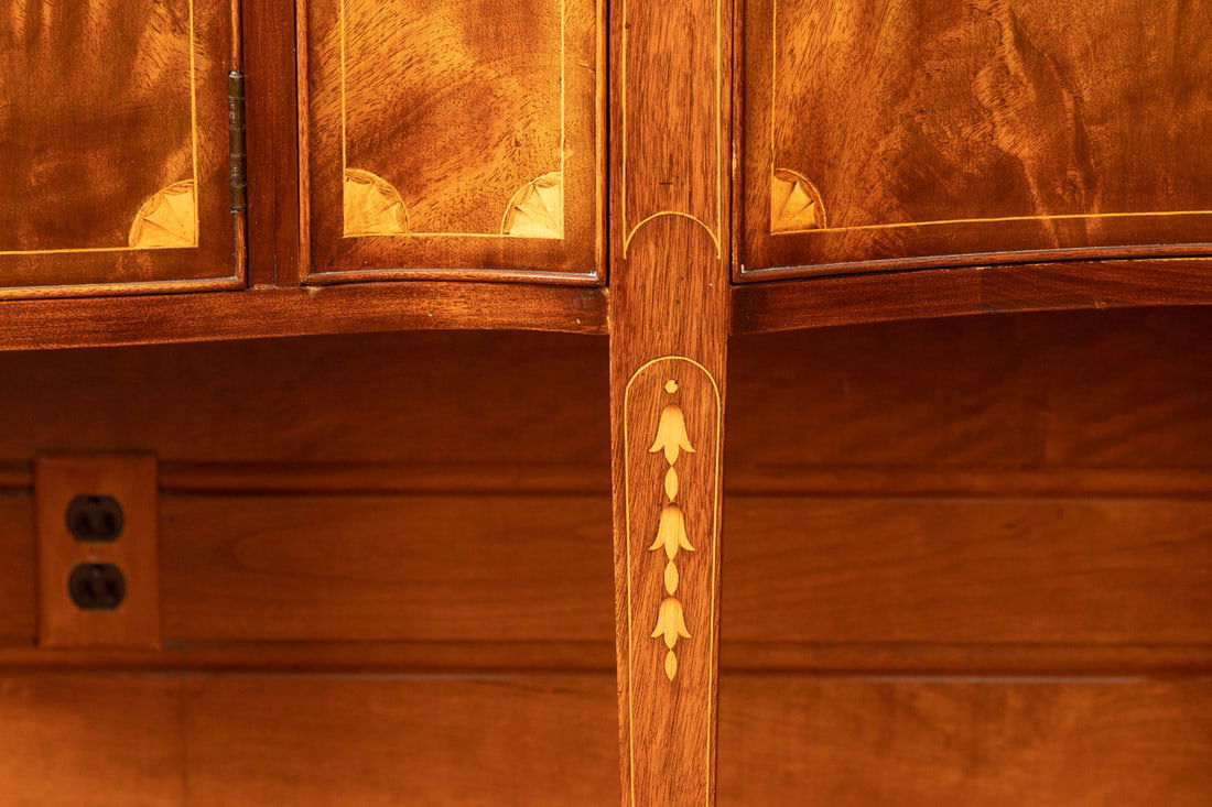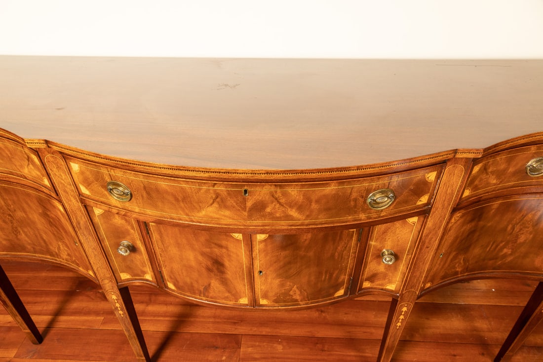 American, 1st quarter-20th century, mahogany. Serpentine front, with fans and bell flower inlay. 39.5" high, 72" wide, 23" deep. Though unmarked, this sideboard is of the type and quality made by the Potthast Brothers of Baltimore, Maryland. Provenance: the collection of the late Jo Louise Brown, Zoar, Ohio. Pickup or freight shipping is required for this lot. Please see our terms for details.